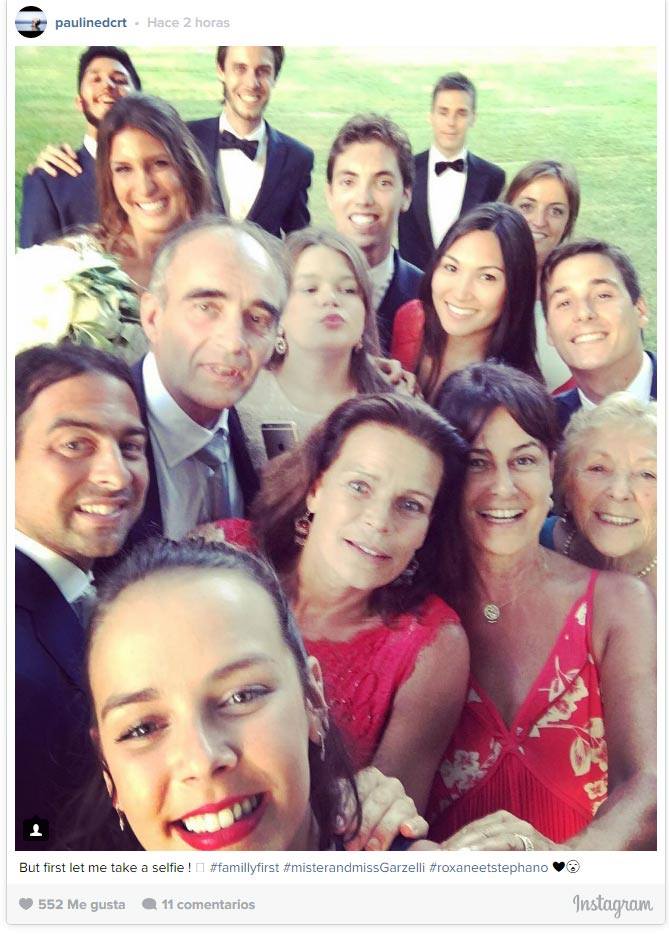 Nel selfie nel parco di Borgo San Luigi si vedono in primo piano Pauline e intorno la madre, principessa Stephanie, e i suoi fratelli, Camille Gottlieb e Louis Ducruet, oltre agli sposi.