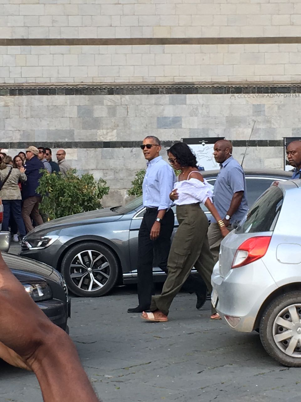 Un ricco menù innaffiato dalle eccellenze del senese, Montalcino in primis, quello che ieri sera, dopo la visita pomeridiana a Palazzo Pubblico e alla Cattedrale di Siena, la carovana di Barack e Michelle Obama, hanno gustato alla rinomata Enoteca I Terzi di Siena di Michele Incarnato. Si è partiti con un tripudio di antipasti, gli immancabili salumi e formaggi toscani, ma anche fiori di zucca fritti con burrata e pomodorini confit ed un millefoglie di carciofi e patate con emulsione di capperi. Tris di primi, per gli ex inquilini della Casa Bianca: risotto agli asparagi, pici al ragù chiantigiano ed una specialità della casa, spaghetti con cipollino di Tropea, acqua di pomodoro, basilico e pecorino romano. I secondi? L’immancabile tagliata e Fiorentina. La cena si è conclusa con un tripudio di dolci: la tavolata ha assaggiato tutti i dessert in carta e, per Barack e Michelle, un bis con il tortino al cioccolato. Il tutto innaffiato da un Igt Made in Montalcino, il Giodo 2014, del super enologo Carlo Ferrini, da un Chianti Classico Riserva 2011 di Carpineta Fontalpino ed un Tenuta di Trinoro vendemmia 2011.