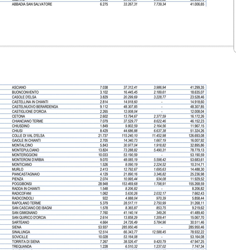 Ecco le cifre destinate ai singoli Comuni della provincia di Siena. Per il capoluogo oltre 285mila euro, a Poggibonsi vanno 155.268.59 euro, a Colle di Val d’Elsa 126.693.08 euro.