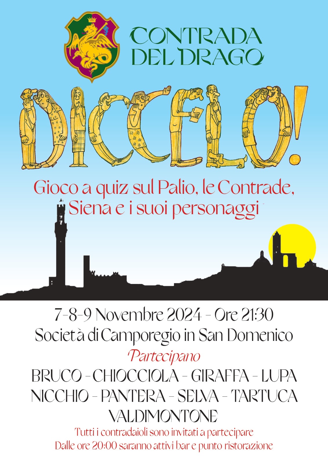 Torna giovedì 7, venerdì 8 e sabato 9 Novembre, la nuova edizione del “DICCELO!”, il gioco a quiz sul Palio, le Contrade, Siena e i suoi personaggi, organizzato dalla Contrada del Drago, in cui si sfideranno nove Contrade: Bruco, Chiocciola, Giraffa, Lupa, Nicchio, Pantera, Selva, Tartuca e Valdimontone.