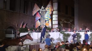 Momenti ricchi di significato anche quelli in cui sono arrivate le due alleate del Leocorno con i loro omaggi: la Pantera ha portato in dono un bellissimo tamburo, mentre la Tartuca due braccialetti capistrada. Il Nicchio invece ha regalato un bellissimo barbero dipinto a mano, “trafitto” da un corno dorato.