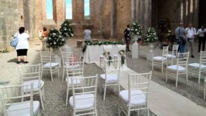 Belli ed emozionati, sono convolati a nozze, nella splendida cornice dell’abbazia di San Galgano, il fantino Giuseppe Zedde detto Gingillo e la modella Federica Regnani.