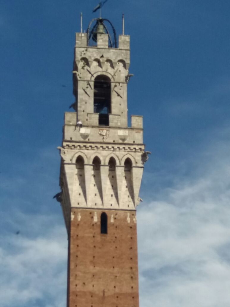Tutta la Piazza del Campo con gli occhi rivolti alla sommità della Torre del Mangia, trattenendo il fiato per il timore che l’uomo alla sommità della torre, seduto con le gambe nel vuoto, avesse intenzione suicide.
