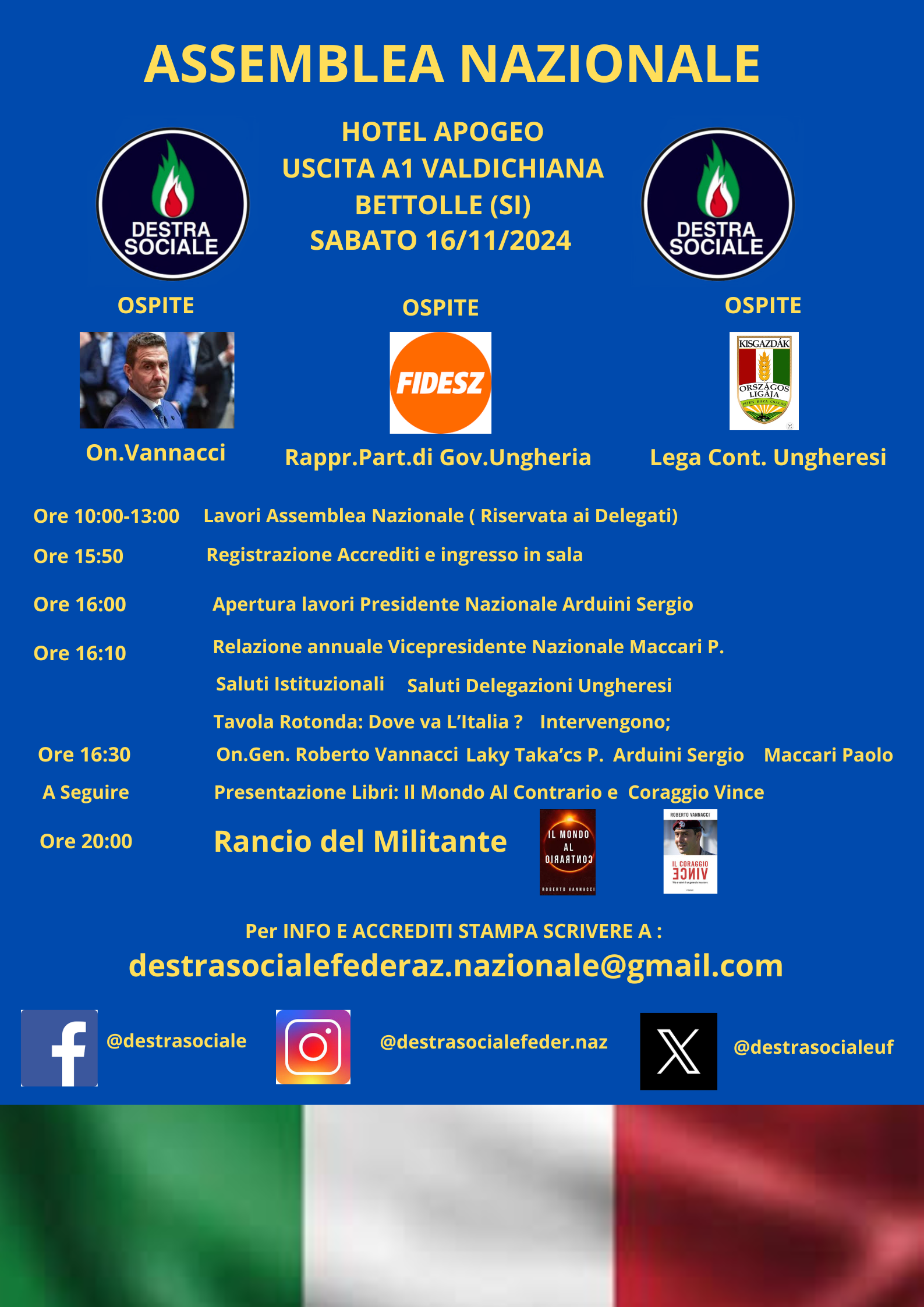 Sabato 16 novembre 2024, dalle ore 10, presso l’ Hotel Apogeo a Bettolle (Sinalunga), di fronte al Casello Autostradale A1 uscita “Valdichiana” si svolgerà l’annuale l’assemblea Nazionale del Movimento Destra Sociale.