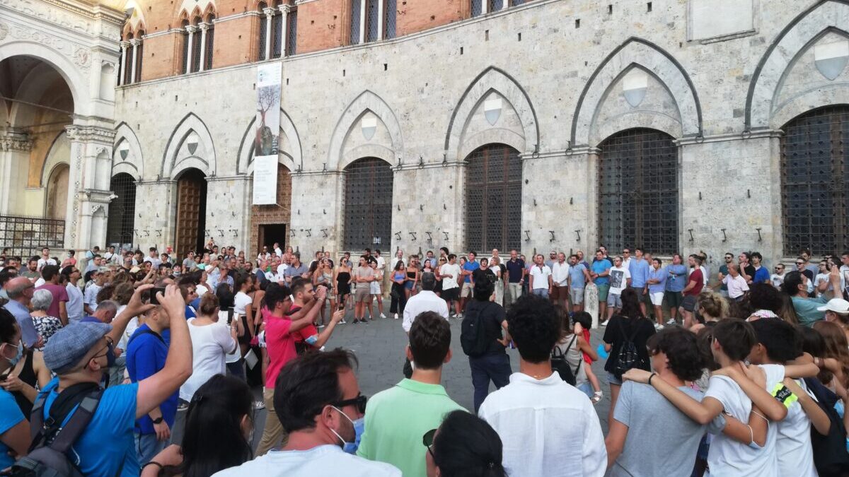 “Sie-Sie-Siena“. Riecheggia forte il grido delle tante persone di tutte le contrade e di tutte le età che si sono riunite questo pomeriggio in Piazza del Campo, davanti a Palazzo Pubblico, in un moto popolare per sottolineare la volontà dei senesi di tornare alla normalità, che oggi, 16 Agosto, avrebbe visto dieci cavalli scendere in Piazza per disputare la Carriera.
