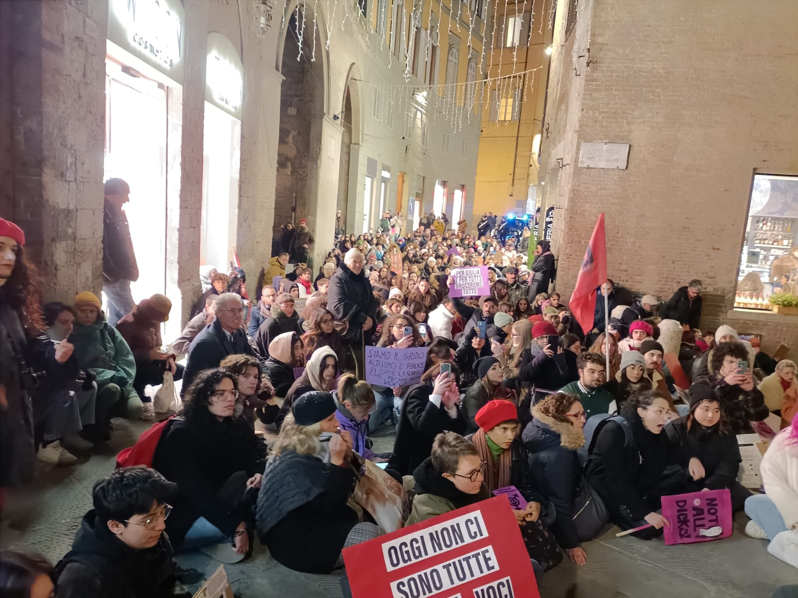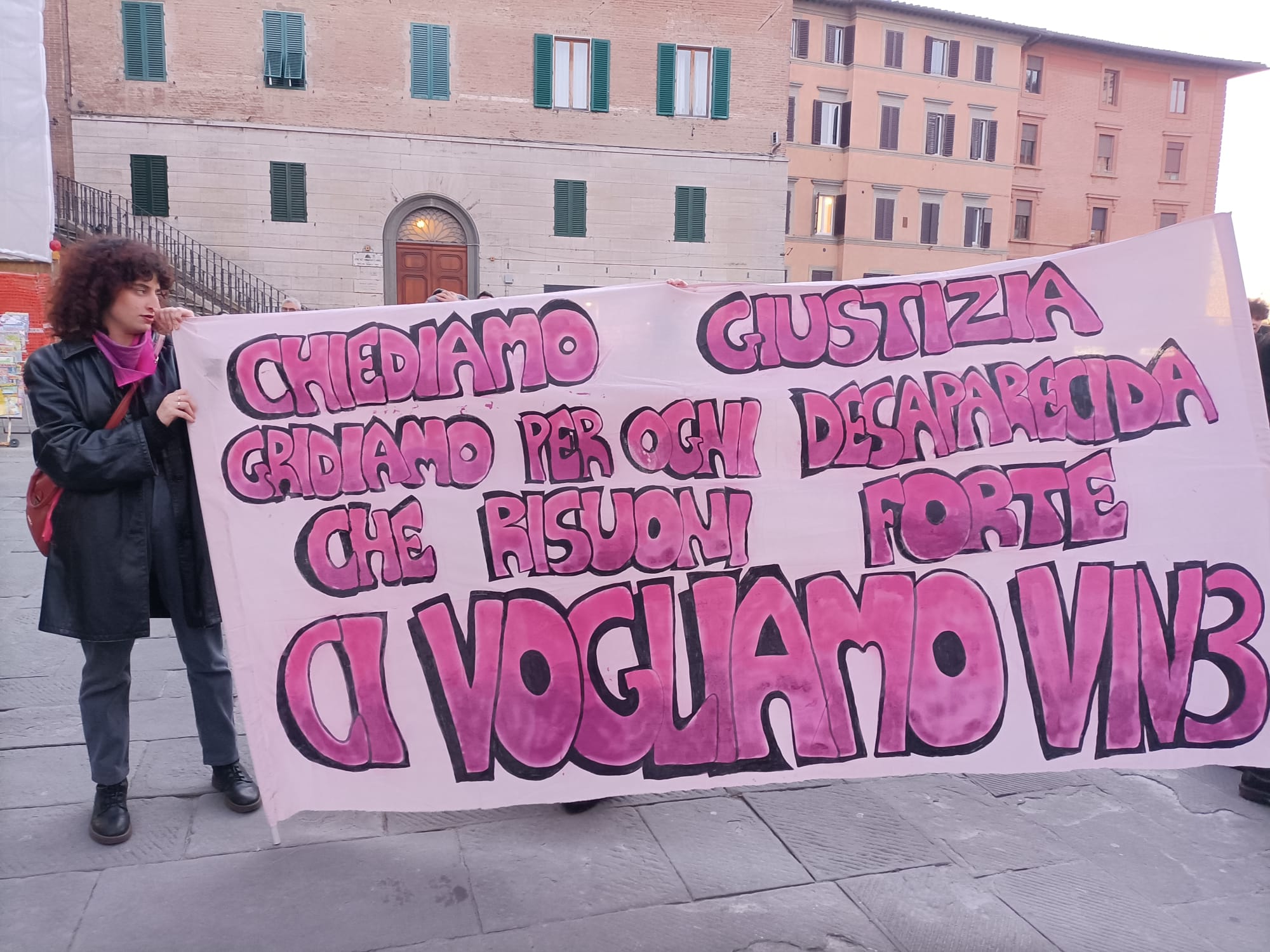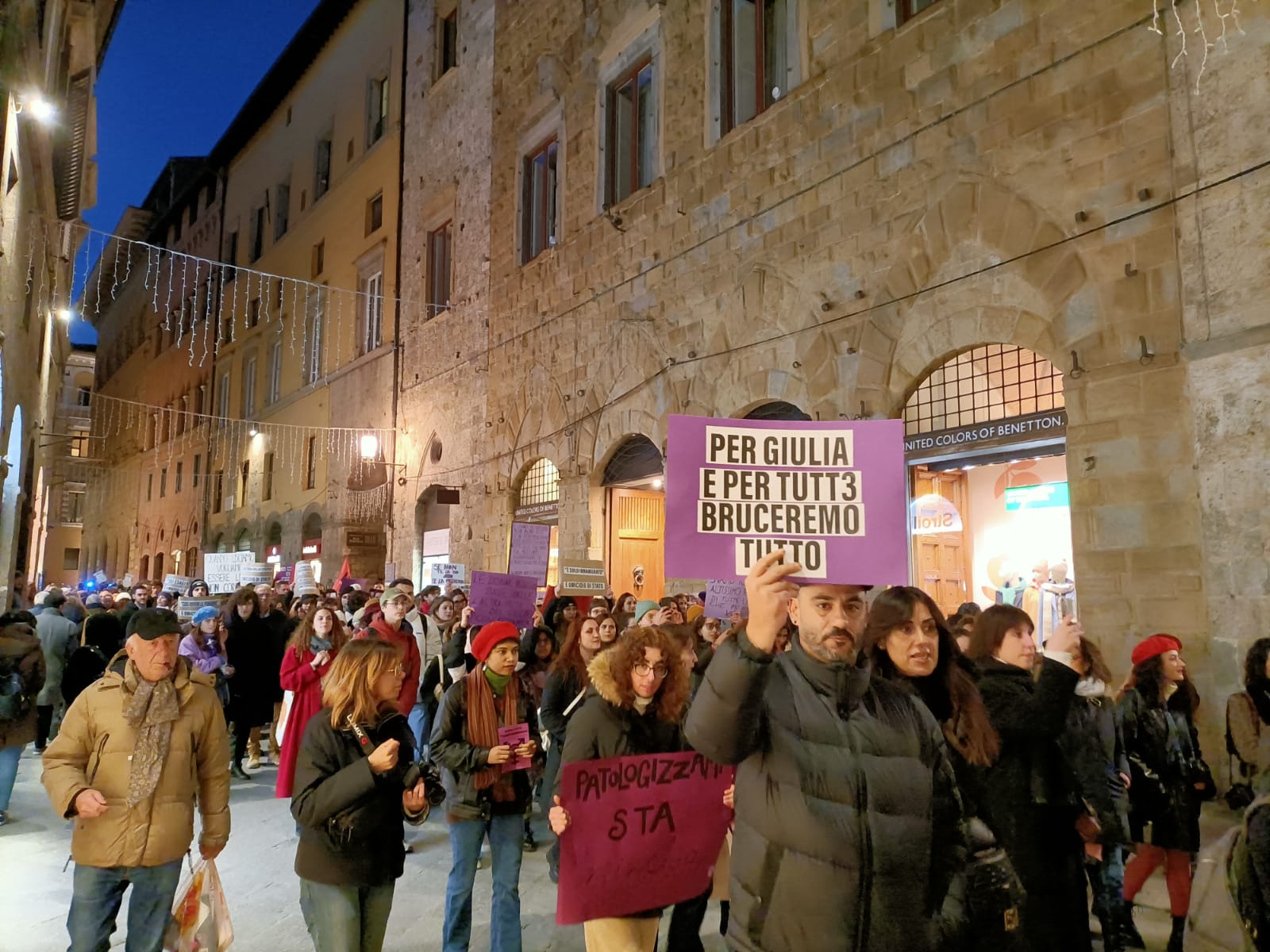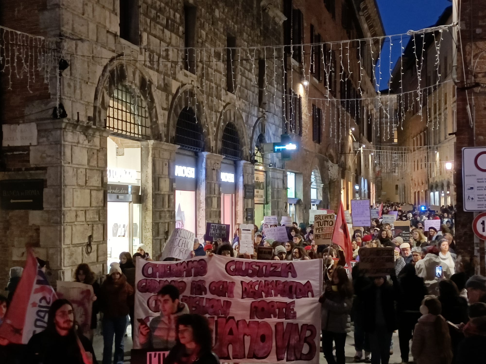 Striscioni, cori, slogan e un grido di dolore univoco per dire basta alla piaga della violenza di genere, il corteo é partito in piazza Matteotti ed é arrivato al Duomo. Di fronte a Piazza del Campo le manifestanti e i manifestanti si sono seduti a terra come segno di protesta, per poi fare un minuto di rumore. Rumore per il truce femminicidio della giovane Giulia Cecchettin, diventata il simbolo della piaga che affligge la società.