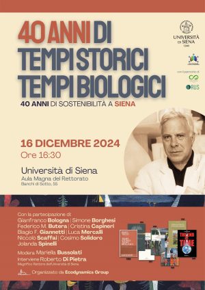 Il 16 dicembre alle ore 16.30, presso l’Aula Magna del Rettorato dell’Università di Siena (Banchi di Sotto 55), si terrà l’evento “40 anni di Tempi Storici Tempi Biologici: 40 anni di sostenibilità a Siena”, per celebrare quello che possiamo considerare l’inizio ufficiale dello studio della sostenibilità a Siena. 40 anni fa, infatti, Enzo Tiezzi ha pubblicato il libro “Tempi Storici Tempi Biologici”, una pietra miliare dello studio della sostenibilità in Italia e nel mondo. Il suo lavoro visionario, ha portato il concetto di sostenibilità all’interno del dibattito scientifico e accademico quando ancora non esistevano termini per descriverlo: la parola “sostenibilità”, nell’uso corrente sarà introdotta tre anni dopo con il Rapporto delle Nazioni Unite, conosciuto come “Rapporto Brundtland”.