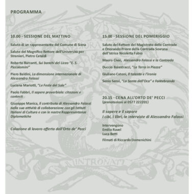 Alle ore 10, dopo i saluti delle istituzioni, parleranno Roberto Barzanti (che ripercorrerà la figura intellettuale di Falassi) e Piero Baldini, che ricorderà la sua dimensione internazionale di studioso. Luciana Mariotti ripercorrerà, poi, il fondamentale lavoro dell’antropologo dedicato a “Le Feste del Sole” (all’interno delle quali Falassi inseriva anche il Palio di Siena), mentre Paolo Fabbri analizzerà gli studi dedicati alla sapienza popolare e ai proverbi. Giuseppe Manica concluderà la sessione del mattino ripercorrendo il contributo di Falassi nella sua attività di collaborazione con gli Istituti Italiani di Cultura e con le nostre Rappresentanze Diplomatiche.