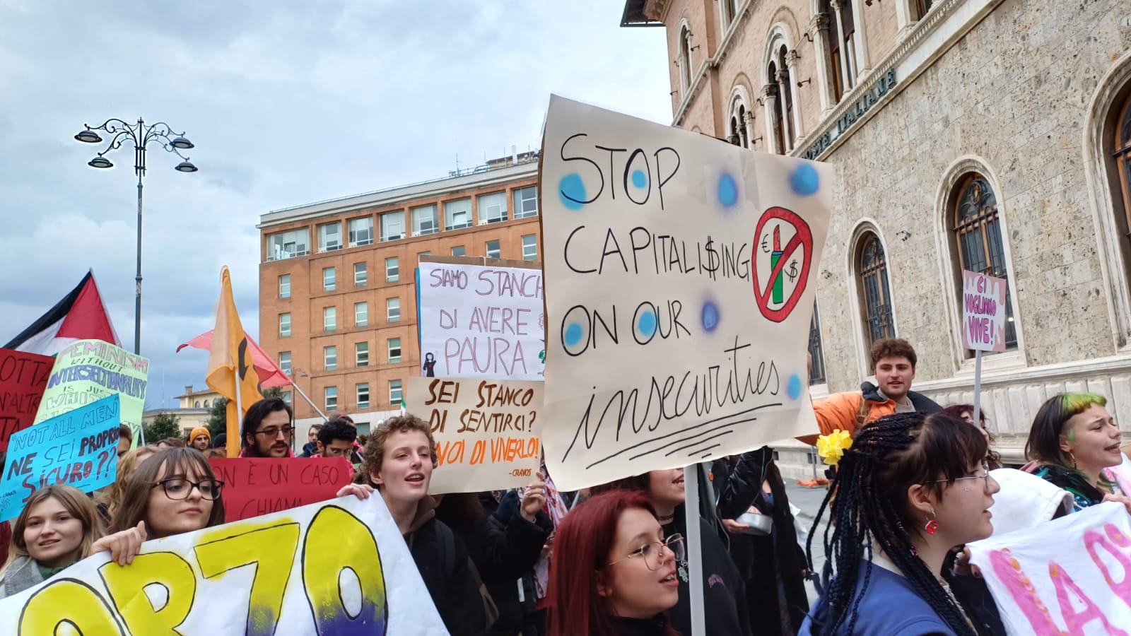 Due cortei che hanno invaso il centro storico, uno orgnizzato da Cravos Siena, l'altro da Link Siena, Frog e Cat