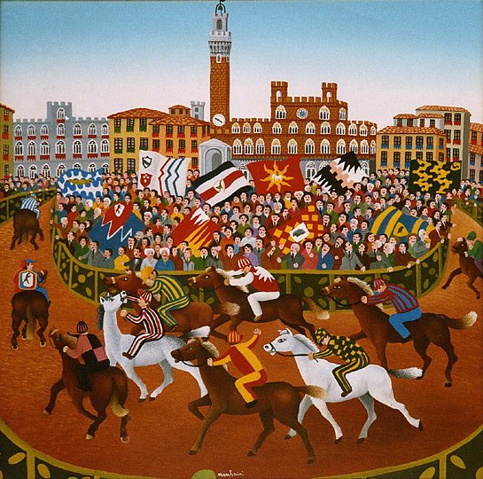 E poi continua: “L’intera festa si compone di cortei storici, della corsa e di festeggiamenti, che culminano sempre in cene grandiose. A questi banchetti si ispira la cena all’aperto che l’Hotel Brunelleschi vuole dedicare alla prima giornata del Palio di Siena: il 2 luglio”.
