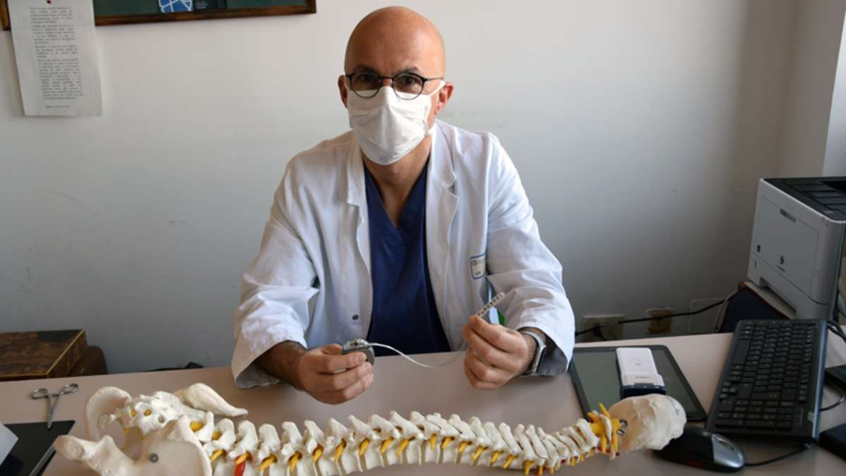 «L’intervento chirurgico prevede l’impianto di una piastrina in silicone con 16 contatti elettrici nel canale spinale dorsale per andare a stimolare il midollo», spiega il neurochirurgo Francesco Cacciola, supportato nell’intervento dall’anestesista Angela Gori e della strumentista Vanessa Pucci. «Gli impulsi per la stimolazione derivano da una batteria ricaricabile che viene impiantata sotto la cute come nei pacemaker cardiaci – aggiunge il dottor Cacciola -. La differenza è che mentre il pacemaker va a stimolare elettricamente il cuore, il neuro-stimolatore va a stimolare delle strutture nervose, al livello cerebrale o spinale».