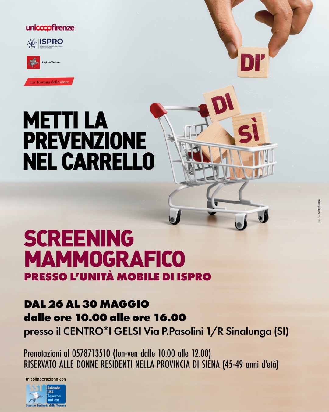 Dal 26 maggio al 30 maggio l’Unità Mobile dell’ISPRO sosterà nel parcheggio del Centro Coop I Gelsi di Sinalunga per consentire di effettuare mammografie per le donne dai 45 ai 49 anni. Le donne residenti in provincia di Siena interessate a prenotare la mammografia possono chiamare per la prenotazione il numero 0578 713510, dal Lunedì al Venerdì dalle ore 10:00 alle ore 12:00.