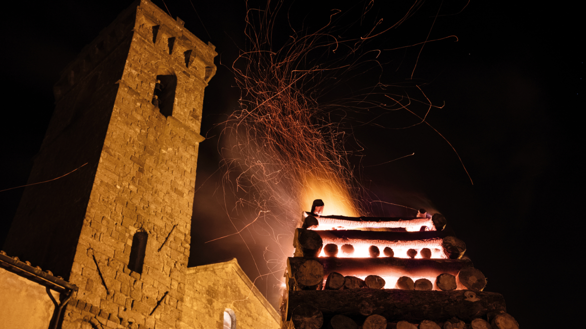 Un appuntamento che viene preparato già dall’autunno quando i “fiaccolai” iniziano a cercare la materia con cui costruire le “fiaccole”, tipiche cataste di legna a forma piramidale alte fino a sette metri che, costruite in ogni angolo del piccolo borgo medioevale, si levano al cielo in attesa della vigilia quando poi verranno incendiate. Una lavorazione impegnativa che coinvolge tutta la comunità impegnandola nella realizzazione di questi monumenti rurali unici. Si intrecciano tronchi sfidando la gravità grazie a tecniche segrete che qui si tramandano di generazione in generazione, per celebrare un rito del fuoco che coinvolge tutti, sposando simbolici significati pagani e religiosi.