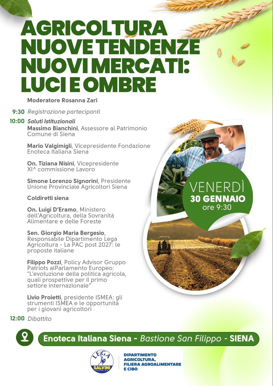 Venerdì 30 gennaio, alle ore 09.30 presso l’Enoteca Italiana Siena (Bastione San Filippo), si terrà un interessante convegno dedicato all’importante settore dell’agricoltura. L’evento è promosso dallo specifico Dipartimento regionale toscano della Lega, coordinato da Rosanna Zari che modererà l’incontro.