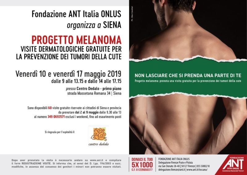 Dopo la due giornate di visite gratuite organizzate a febbraio, Fondazione ANT riporta a Siena il Progetto Melanoma. Il 10 e 17 maggio i cittadini di Siena e Provincia avranno a disposizione 60 visite dermatologiche gratuite per la diagnosi precoce dei tumori della cute.