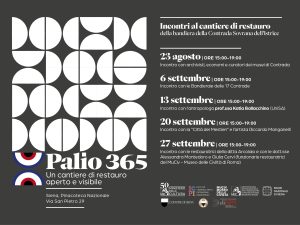 Nell’ambito del cantiere, tra il 23 agosto e il 27 settembre 2025 si svolgerà un ciclo di cinque incontri pubblici, pensati per coinvolgere la cittadinanza, i contradaioli e tutti i visitatori interessati alla storia viva di questo patrimonio. Gli incontri a ingresso libero si terranno tutti i sabati presso la Pinacoteca Nazionale, con orario 15.00 – 19.00, secondo il seguente calendario: