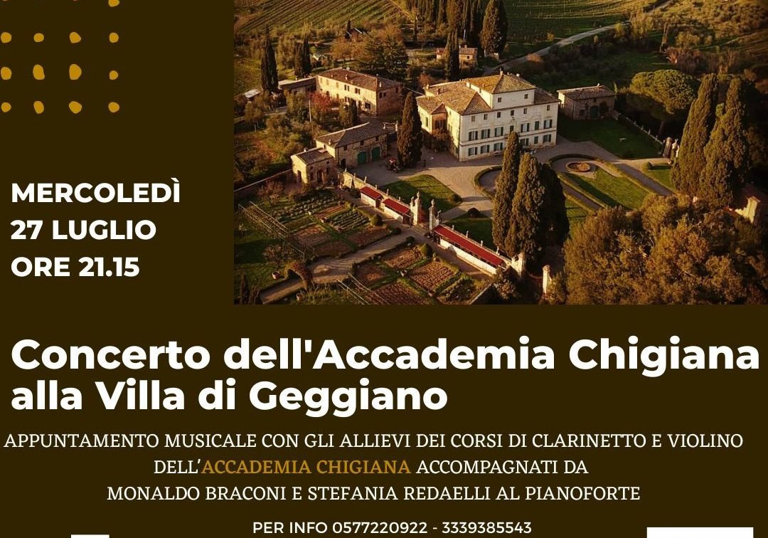 Continuano a ritmo serrato gli eventi del cartellone estivo promosso dal Comune di Castelnuovo Berardenga. Stasera, alle ore 21.15, alla Villa di Geggiano si esibiranno gli allievi dell’Accademia Musicale Chigiana iscritti ai corsi di clarinetto, del docente Alessandro Carbone, e di violino, del docente Ilya Gringolts, accompagnati da Monaldo Braconi e Stefania Redaelli al pianoforte.