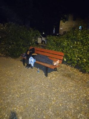 Si ripete il fenomeno delle persone, per lo più stranieri, che scelgono i giardini fuori Porta San Marco per allestire il loro ricovero, incuranti anche del fatto che la zona sia piuttosto frequentata in queste sere di festa per la contrada della Chiocciola.
