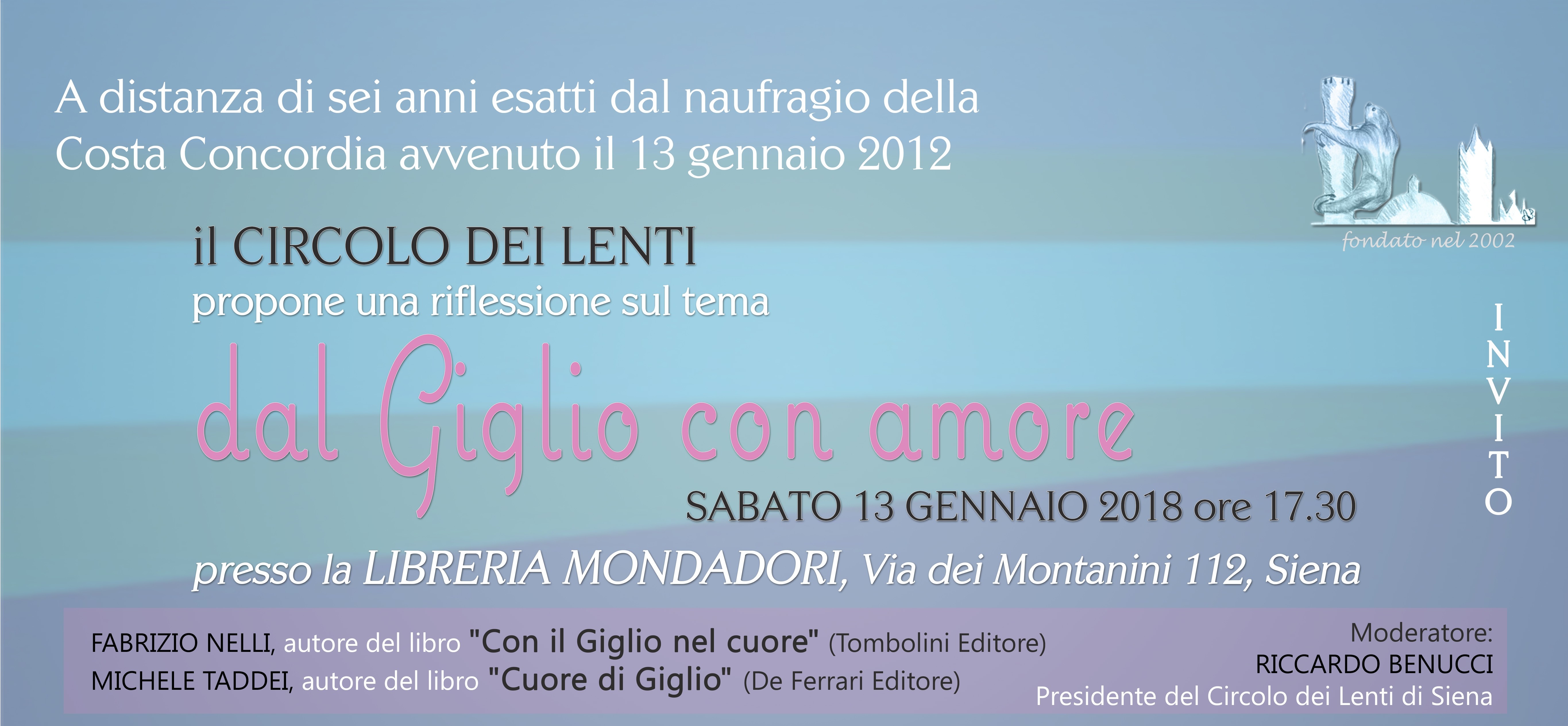 Sabato 13 Gennaio alle ore 17,30 presso la libreria Mondadori di Siena (Via Montanini 112), promossa dal Circolo dei Lenti, si terrà una riflessione sul tema “Dal Giglio con amore”. A sei anni esatti di distanza dal naufragio della Costa Concordia, due autori, con la moderazione del presidente del Circolo dei Lenti, Riccardo Benucci, parlano dell’Isola del Giglio attraverso i loro libri che condividono l’amore per l’isola dell’Arcipelago Toscano. Entrambi i testi presentano nel titolo la parola cuore: “Con il Giglio nel cuore” (Antonio Tombolini Editore) per Fabrizio Nelli, “Cuore di Giglio” (De Ferrari Editore) per Michele Taddei.
