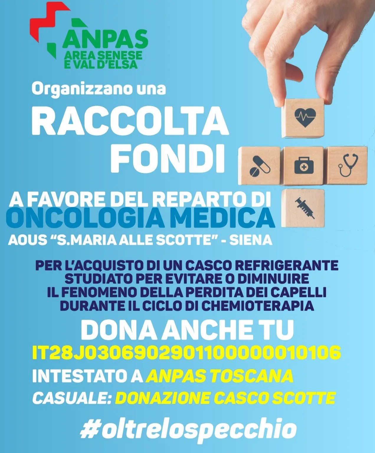Era stata lanciata la scorsa primavera dalle Pubbliche Assistenze Area Senese e Val d’Elsa la raccolta fondi “Oltre lo specchio” a favore del reparto di oncologia medica dell’AOUS “Santa Maria alle Scotte” di Siena per l’acquisto di un casco refrigerante studiato per evitare o diminuire il fenomeno della perdita dei capelli (alopecia) associata alla chemioterapia. Fino ad oggi, grazie alle donazioni di privati cittadini, alle iniziative delle Pubbliche Assistenze, di alcune Contrade e con il sostegno di tante associazioni e attività socio-ricreative del territorio provinciale, è stato raggiunto l’importo di € 28.329,00.