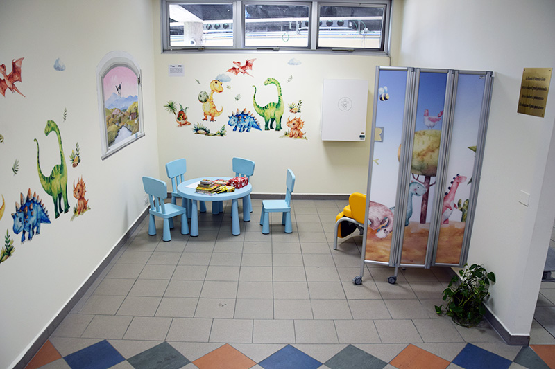 Gli arredi del Baby Pit-Stop sono stati donati dalle associazioni AVO e AUSER, grazie ai fondi raccolti con la vendita di beneficenza dei libri organizzata dalla Biblioteca ospedaliera. La sala è inoltre impreziosita da un affresco donato nel 2017 dal compianto artista Cesare Olmastroni, per offrire anche bellezza e accoglienza alle mamme e ai loro piccoli.
