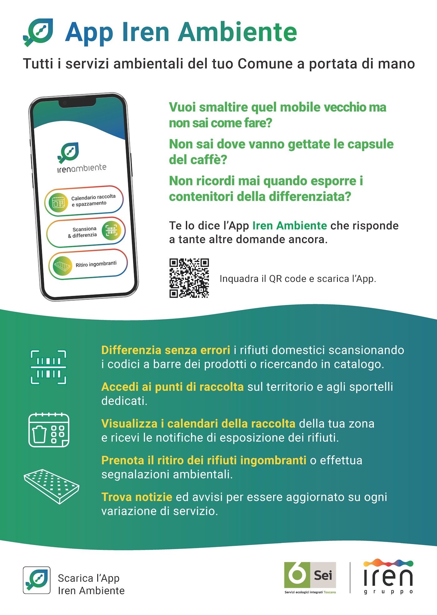 “Possiamo proprio dire che l’ambiente è sempre più a portata di mano – dice il presidente di Sei Toscana, Alessandro Fabbrini –. L’ingresso di Sei Toscana nel mondo del Gruppo Iren porta un ulteriore beneficio alle nostre comunità, mettendo a disposizione di tutti, in modo gratuito, uno strumento utile per gestire correttamente i propri rifiuti. La nuova app prende il posto di quella utilizzata da Sei Toscana in questi anni, portando alcune migliorie e offrendo diverse funzionalità per il cittadino”.