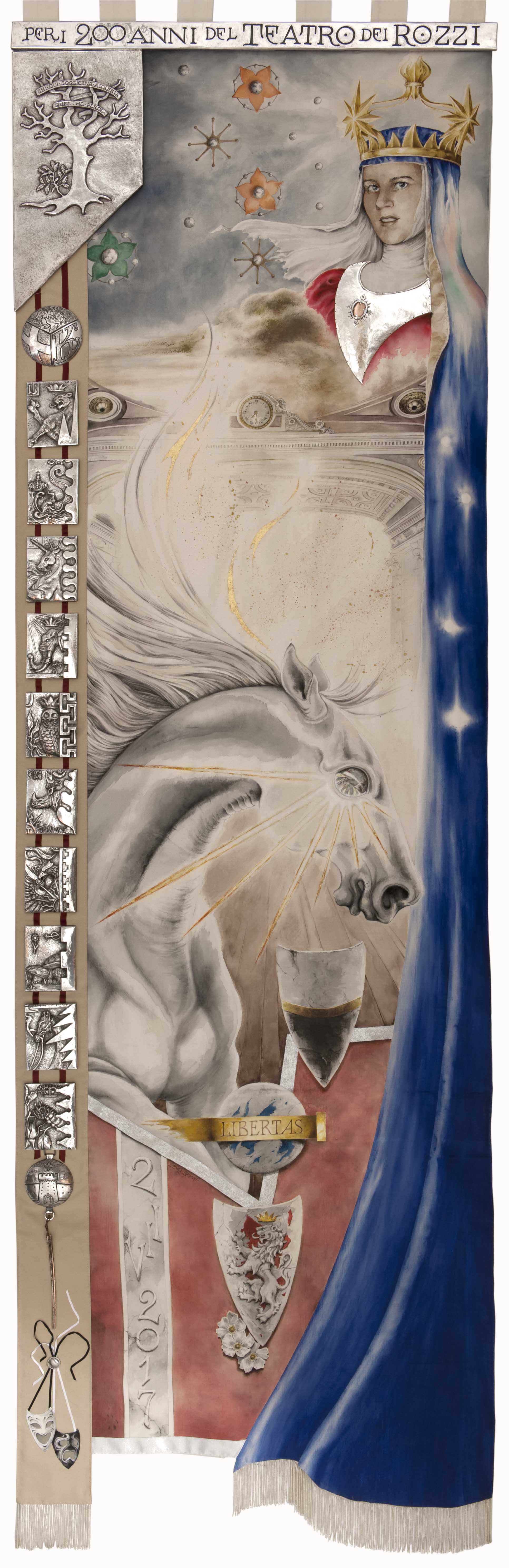 Un’opera, nel suo complesso, che nasce dal movimento di tanti elementi: metalli, colori, ricami, per un messaggio poetico che Laura Brocchi ha saputo creare sul drappo di seta con la sapienza e l’abilità di mani guidate da un cuore senese e contradaiolo.