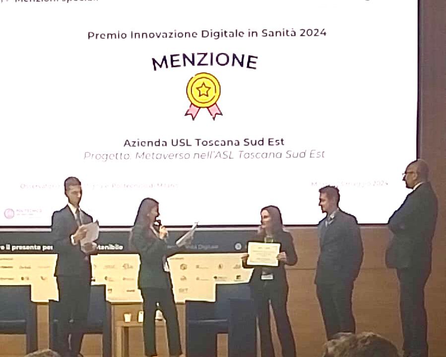 Premio Innovazione Digitale in Sanità 2024: a riceverlo la Asl Toscana Sud Est ieri a Milano da parte del Politecnico di Milano e di Osservatori.net Digital Innovation. Il riconoscimento, andato al progetto su Metaverso realizzato nella Casa di Comunità di Abbadia San Salvatore, è rivolto “alle realtà che hanno mostrato capacità di utilizzare le tecnologie digitali come leva di innovazione e miglioramento”. Il premio è stato consegnato a Maria Giovanna D’Amato dell’Area Dipartimentale Innovazione e sviluppo della Asl Toscana Sud Est durante il convegno “Sanità digitale: trasformare il presente per un futuro sostenibile”.