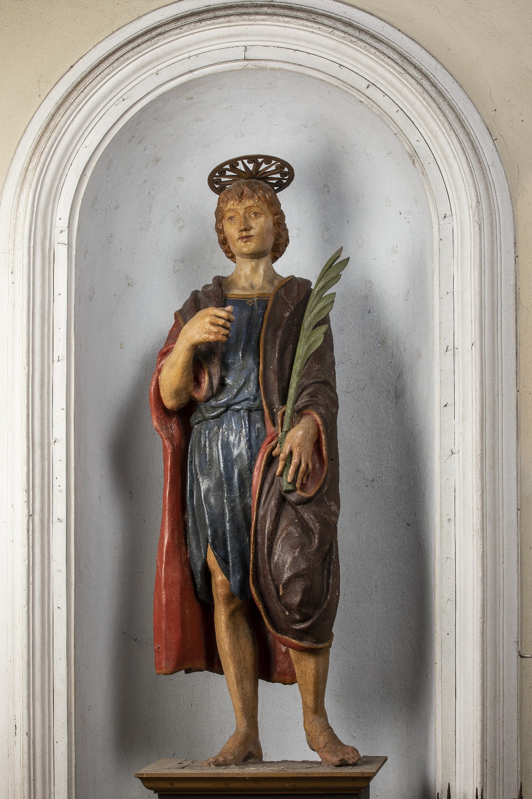 La scultura, che dalla lettura dei segni iconografici dovrebbe raffigurare un santo martire, ritrae un giovane santo imberbe con i capelli riccioluti ridipinti di biondo e un incarnato olivastro dovuto forse ai viraggi delle vernici. Indossa un abito semplice lungo fino al ginocchio, color blu di Prussia, e un mantello di un marrone ruggine, con la fodera rossa e i profili bordati di giallo ocra, che lo copre dalle spalle ai polpacci. Di giallo ocra è anche l’unica lineare decorazione della veste blu, lungo il profilo superiore. L’intaglio in esame evidenzia i caratteri tipici di una scultura senese del Rinascimento, trovando stringenti punti di contatto con la produzione di Neroccio di Bartolomeo de’ Landi. L’attribuzione a Neroccio, si basa sull’affinità stilistica che il santo martire rivela con le opere scolpite dal maestro nel corso degli anni Settanta del Quattrocento: non solo con la Santa Caterina da Siena dell’Oratorio di Fontebranda a Siena, ma anche con l’Angelo annunciante oggi della Collezione Salini nel Castello di Gallico di Asciano. È presumibile che la scultura non sia nata per l’Oratorio di San Lazzaro e tale evenienza è supportata soprattutto da ragioni iconografiche. L’ipotesi più credibile è che l’opera sia stata commissionata per un’altra destinazione e che, con il trasferimento negli annessi del lazzaretto fuori Porta Romana, sia stata riadattata al culto locale e trasformata in un San Lazzaro.
