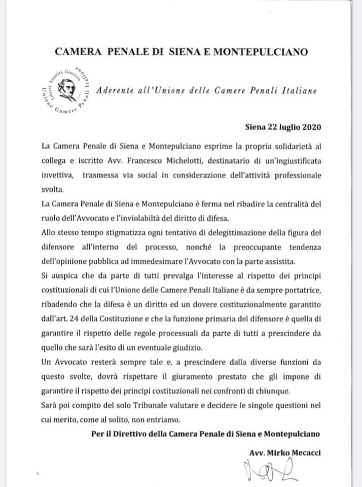 Il direttivo della Camera Penale di Siena e Montepulciano ha voluto esprimere con un documento ufficiale la propria solidarietà all’assessore alla sicurezza del Comune di Siena Francesco Michelotti, in quanto “destinatario – si legge (in foto) – di un’ingiustificata invettiva trasmessa via social in considerazione dell’attività professionale svolta”.
