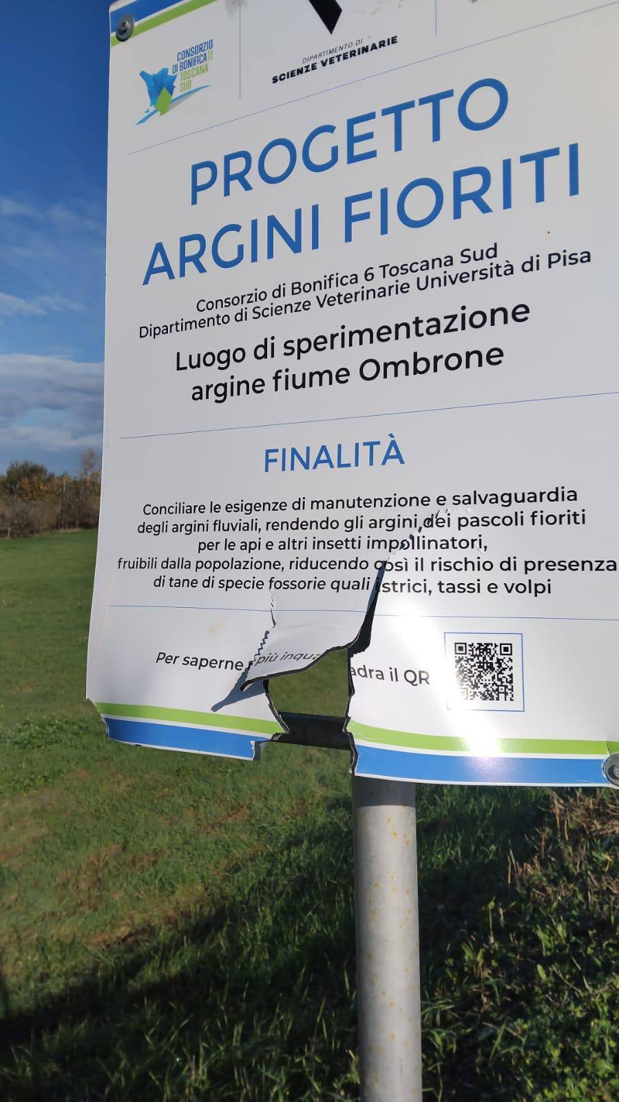 “Premettendo il fatto che siamo stati tutti ragazzi e l’adolescenza è un momento della vita in cui si cerca di fare quello che è convenzionalmente proibito – dice il sindaco -, qui c’è qualcuno che si diverte in modo inopportuno. Sono stati fatti esplodere dei petardi che hanno danneggiato i cartelli del progetto “Argini fioriti”, di rilevanza nazionale, un progetto del Consorzio di Bonifica, con ANBI e l’università di Pisa.