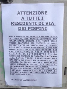 Una serie di atti di vandalismo nei confronti delle auto parcheggiate dai residenti durante la notte: è avvenuto nella notte di sabato 4 marzo in via dei Pispini, nel tratto compreso tra piazza Santo Spirito e il museo della contrada del Nicchio, ed i danneggiati hanno deciso di organizzarsi.