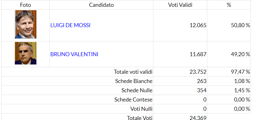 Valentini sconfitto per 378 voti. 263 schede bianche, 354 voti nulli.