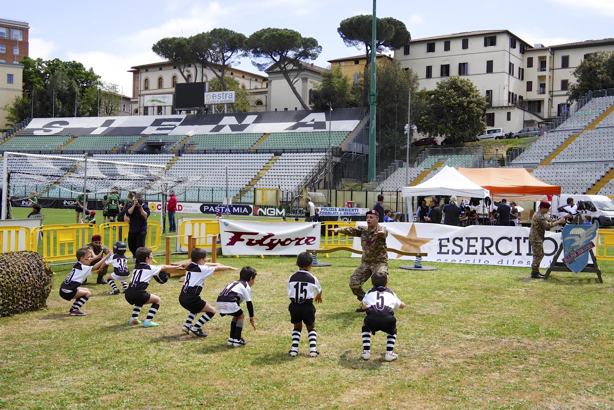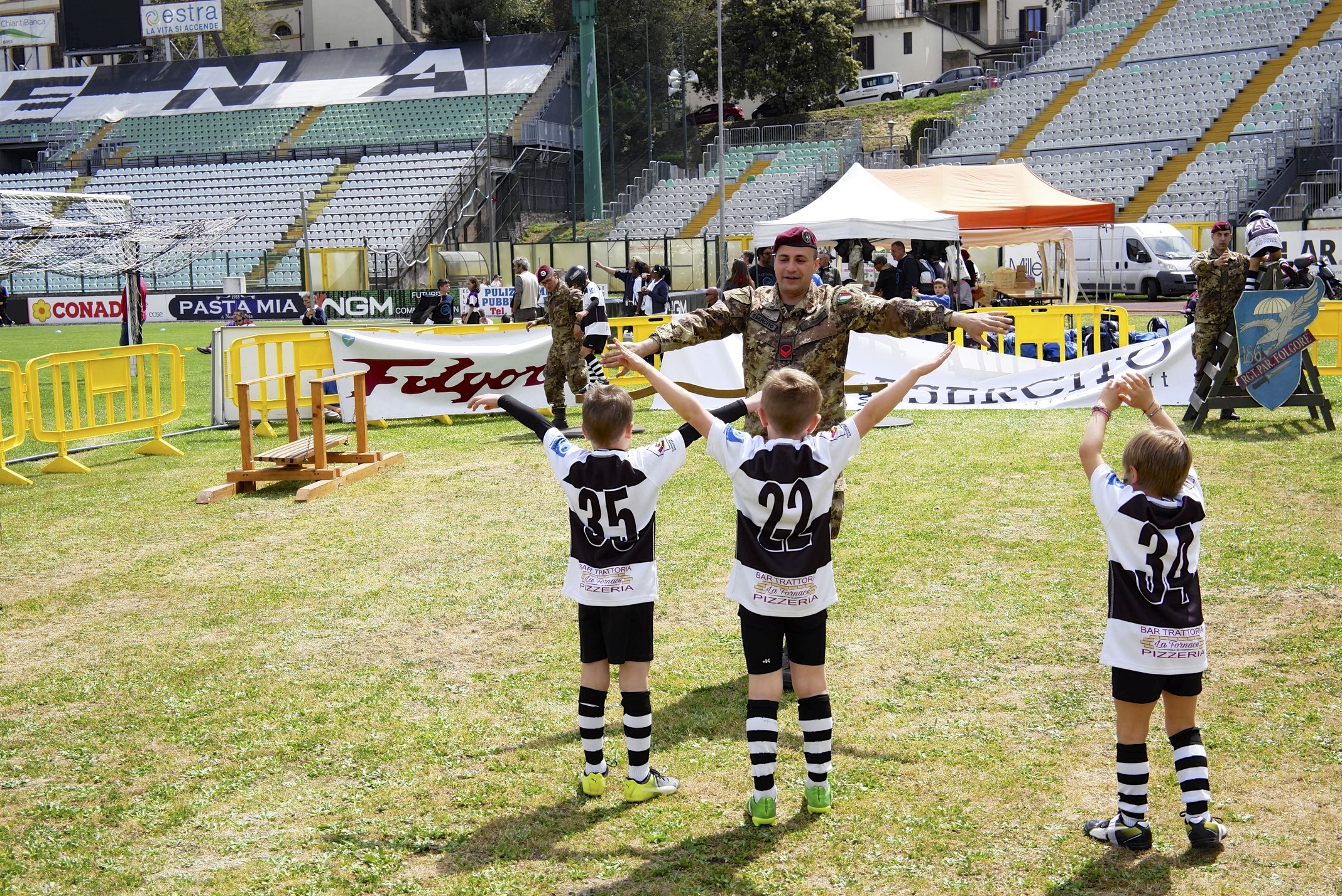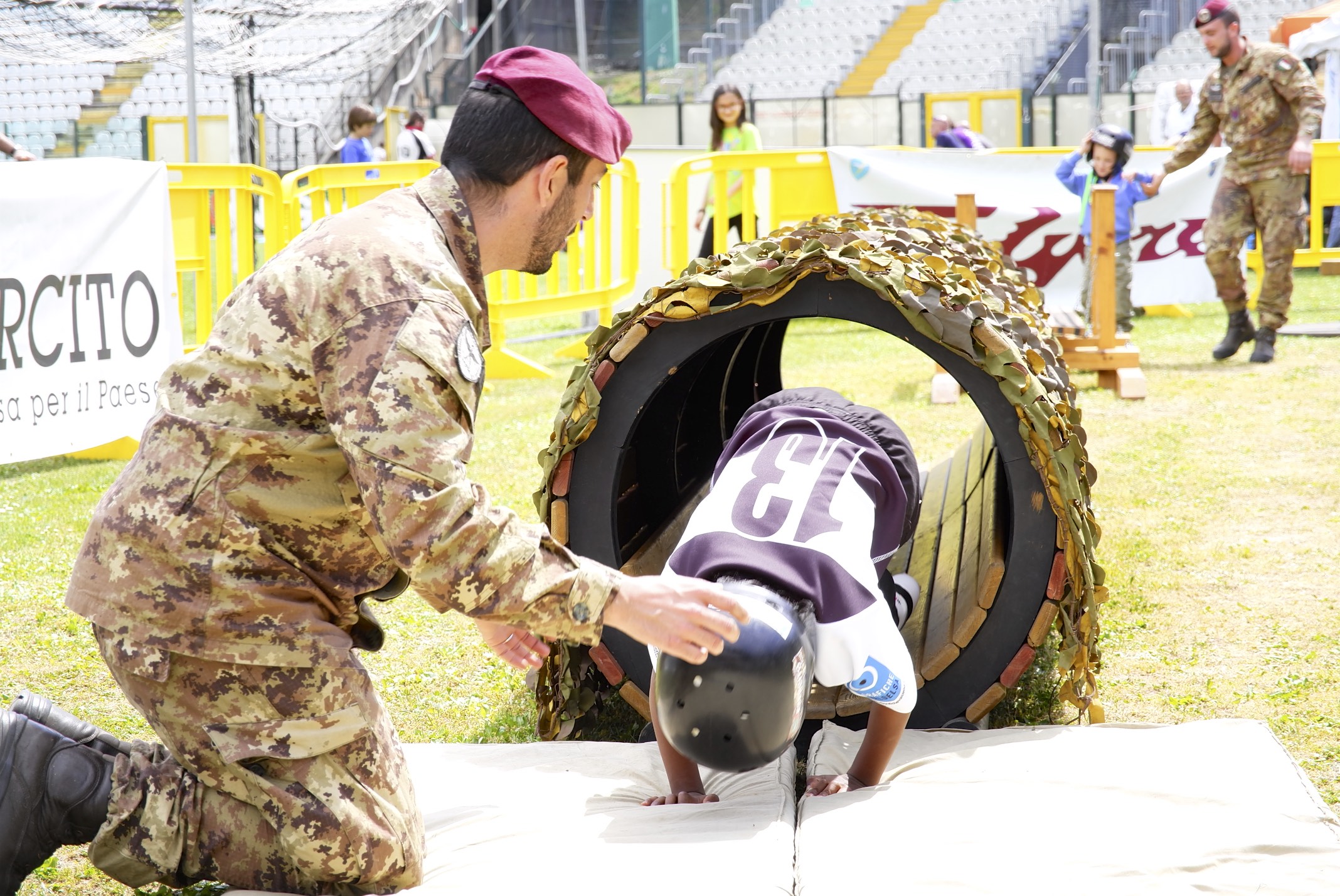 I militari dell’186 hanno infatti approntato un percorso di guerra all’interno dello stadio Franchi che ha letteralmente affascinato tutti i giovani atleti.