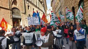 La mobilitazione è partita da Piazza Salimbeni e sta per concludersi con un comizio davanti alla Prefettura con i lavoratori seduti sulla scalinata del Duomo. Presenti anche il sindaco di Siena Nicoletta Fabio, la parlamentare del Pd Laura Boldrini. In corteo anche i segretari generali Cgil-Cisl-Uil Toscana Rossano Rossi, Silvia Russo e Paolo Fantappiè ed i segretari delle sigle locali di categoria.