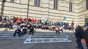 I lavoratori stanno manifestando indossando le pettorine “Beko in lotta” e “299 motivi per resistere”. Alla testa del corteo lo striscione con scritto “Rsu Beko Europe Siena in lotta”.