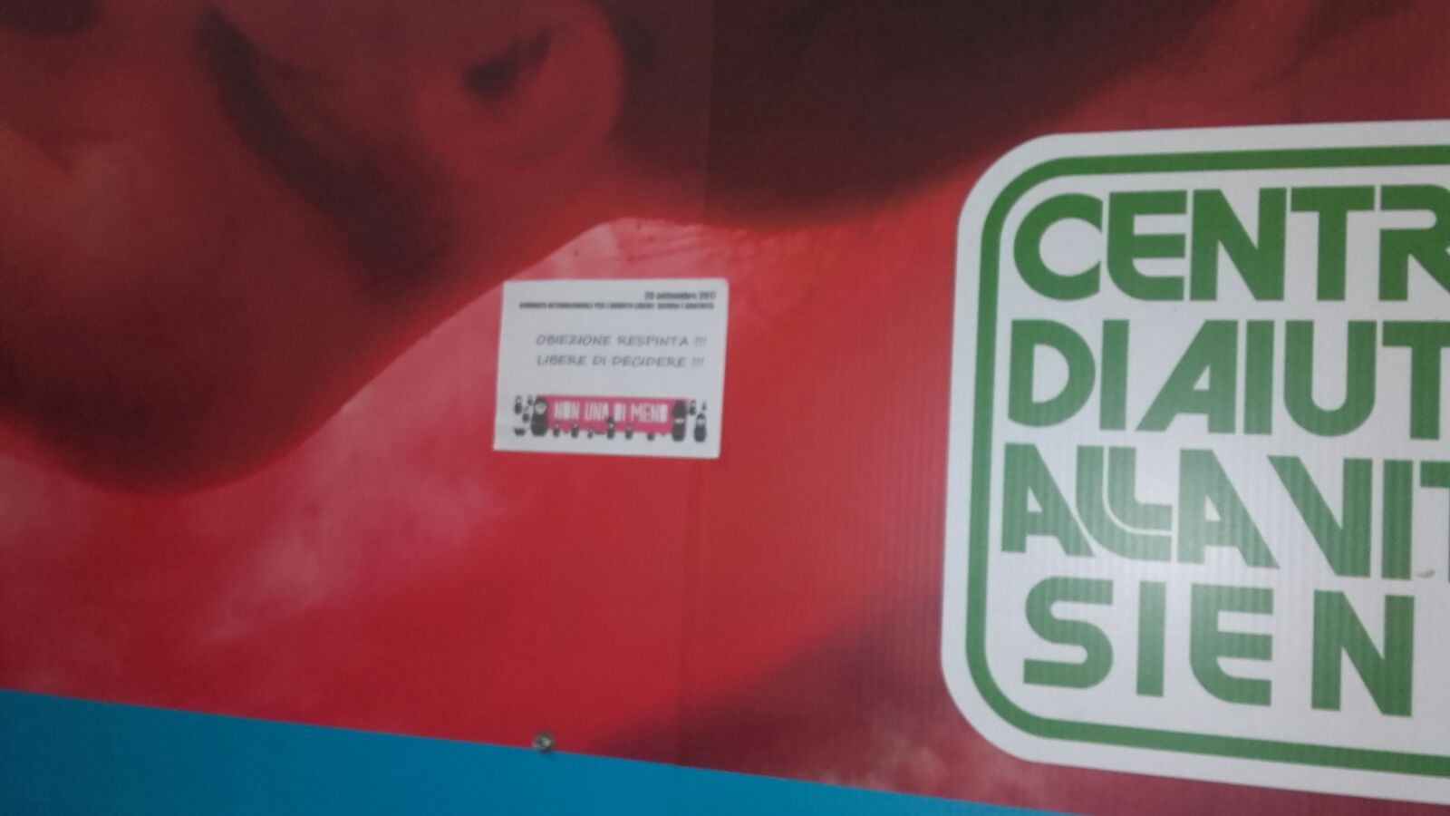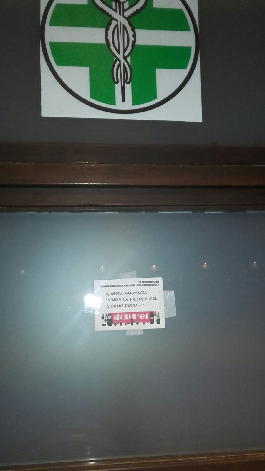 Volantini sulle vetrine e sulle bacheche delle farmacie di Siena, con la scritta “Qui si vende la pillola del giorno dopo?” ed altri sui muri della città con lo slogan “Obiezione respinta, libere di decidere” e il logo del collettivo “Non una di meno”: così si è svegliata stamani la città dopo il blitz notturno messo in atto nella ricorrenza del 28 settembre, dichiarato, dal 1990, Giornata di azione internazionale per l’aborto sicuro. La campagna, lanciata dall’appello delle donne argentine, é stata sostenuta dalla richiesta all’Onu di 1800 collettivi di 115 diversi paesi.
