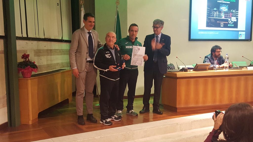 Una stella di Natale quanto mai gradita e speciale ha contrassegnato la fine della stagione sportiva 2018 della Boxe Siena Mens Sana: il 24 Novembre scorso, nell’ambito di una cerimonia ufficiale organizzata dal Comitato territoriale del CONI, è stata consegnata nelle mani del Presidente Romano Borgogni e del Maestro David Borgogni la Stella di Bronzo al Merito Sportivo per l’anno 2017, una prestigiosa onorificenza che il Coni conferisce alle società sportive che più si sono distinte per aver contribuito all’affermazione e alla crescita dello sport italiano. Grazie a questo importante riconoscimento sono stati attestati, di fronte al mondo sportivo italiano, i meriti di una società pugilistica che da più di mezzo secolo partecipa attivamente alla promozione e al prestigio della disciplina pugilistica nel panorama cittadino, regionale e nazionale.