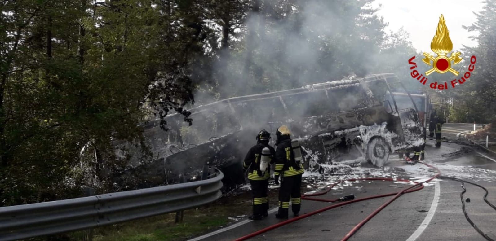 Un incendio spaventoso quello che ha avvolto il bus turistico che questo pomeriggio ha preso fuoco a Castellina in Chianti. Il mezzo, italiano, con a bordo turisti stranieri impegnati in un tour del territorio, stava transitando quando si è improvvisamente fermato per un guasto, sulle cui cause stanno indagando i carabinieri. L’autista, intuendo il pericolo, ha fatto scendere tutti e subito dopo il bus ha cominciato a bruciare, andando a sprofondare nella scarpata. Il rogo lo ha completamente distrutto. Per fortuna tutti gli occupanti sono risultati sani e salvi, ma si tratta di una tragedia scampata, che riaccende i riflettori sulle condizioni di sicurezza dei bus turistici, spesso al centro di controversi casi di cronaca. Sul posto sono giunti i vigili del fuoco di Siena per domare le fiamme, i volontari Racchetta e anche la polizia municipale di Castellina, per gestire il traffico. L’intervento è durato alcune ore, per motivi di sicurezza è stata provvisoriamente chiusa la viabilità sulla Chiantigiana al bivio tra Fonterutoli e bivio San Leonino, dove era visibile lo scheletro del bus arso dalle fiamme, rimosso in serata.