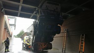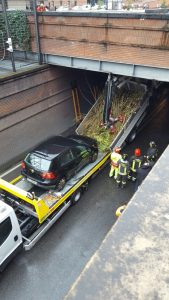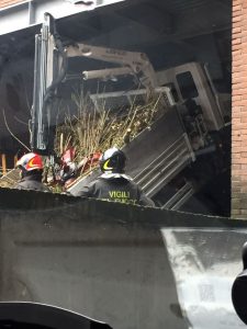 Non è reso conto che il ragno meccanico era troppo alto ed ha infilato il sottopasso della stazione: il braccio è rimasto bloccato ed ha fatto impennare la parte anteriore del camion la cui cabina è andata a sbattere nel soffitto. Un incidente spettacolare per fortuna senza gravi conseguenze: per i due occupanti la cabina solo qualche escoriazione. Sono stati fatti scendere dall’altezza ragguardevole dai vigili del fuoco.