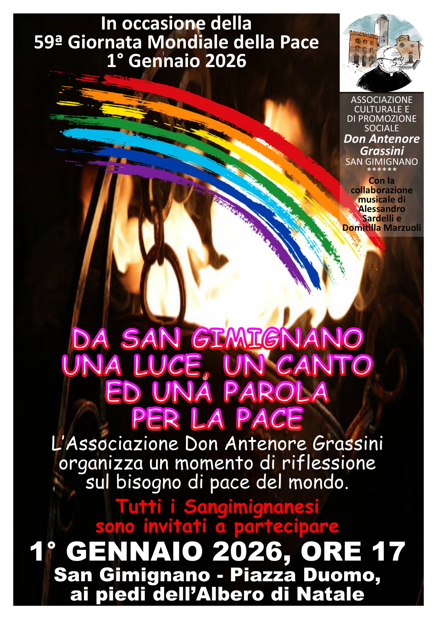 Ci ritroveremo ai piedi del grande albero di Natale di Piazza Duomo a San Gimignano alle ore 17, illuminati dalla fiamma di un cero, simbolo di luce e di calore, per ascoltare alcune riflessioni tratte da scritti sul tema, tra cui alcuni brani dei messaggi di Papa Leone e del Presidente della Repubblica Sergio Mattarella, e per cantare insieme alcune canzoni della tradizione pacifista.