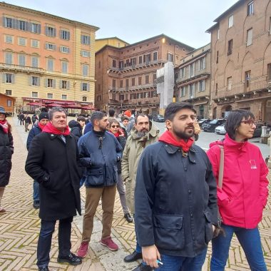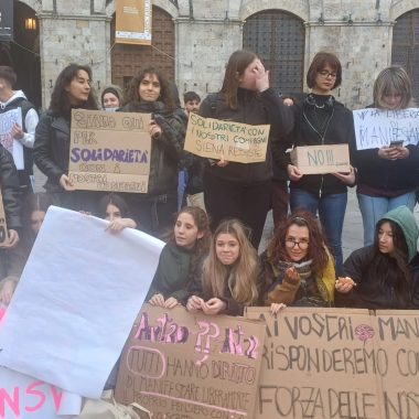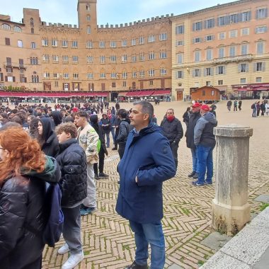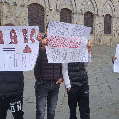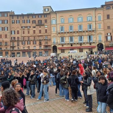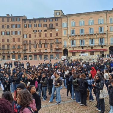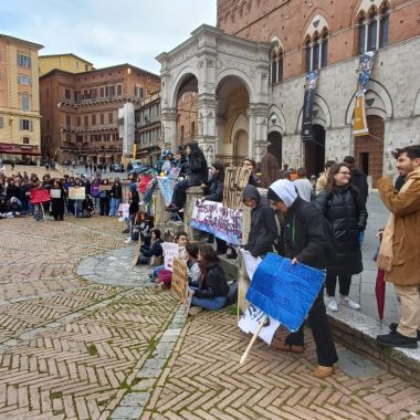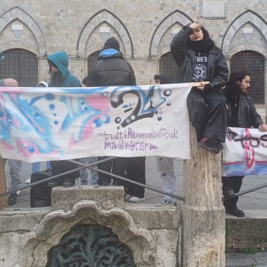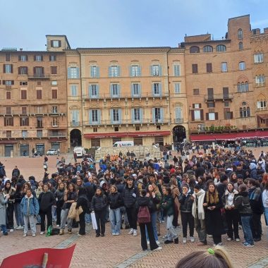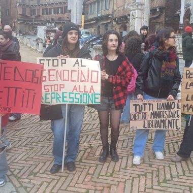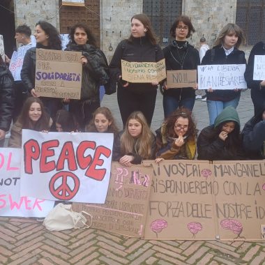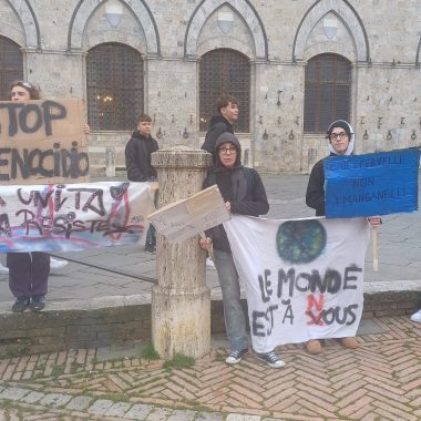 “Siamo scesi in Piazza per esprimere la nostra libertà di pensiero. Possiamo dire quello che vogliamo e quando vogliamo – ha affermato il rappresentante d’Istituto del Sarrocchi di Siena, Diego Maletta Aloe – . Quello che è successo a Pisa e Firenze è inaccettabile, perchè a Gaza c’è un popolo che da 75 anni è recluso in un pezzo di terra e adesso è bombardato ogni giorno. Quando viene reclusa la libertà di un popolo, viene reclusa anche la libertà di chi sostiene quel popolo. Non è democrazia manganellare persone in piazza”. Siamo qui per esprimere solidarietà per gli studenti aggrediti, ma soprattutto per dire che è un diritto essere liberi di essere in disaccordo con lo Stato – ha sottolineato la studentessa del Liceo Artistico, Dorotea Corsi -. Io ho aperto la manifestazione con una poesia, penso che questo presidio è stato importantissimo, perchè è un modo per farci sentire e per far vedere che noi coetanei ci stiamo sostenendo insieme”. Insieme a loro anche alcuni docenti, come Claudia Rao, insegnante del Liceo Artistico. “Ci sentiamo direttamente coinvolte – ha evidenziato Rao – , perchè ogni giorno insegniamo ai nostri studenti a prendere parola, ad impegnarsi alla crescita morale del nostro paese. Rispondere con i manganelli è un fallimento anche nostro che ci impegnamo a farsì che questi ragazzi vivano con coscienze libere. E’ il mio giorno libero ma non potevo non esserci”.