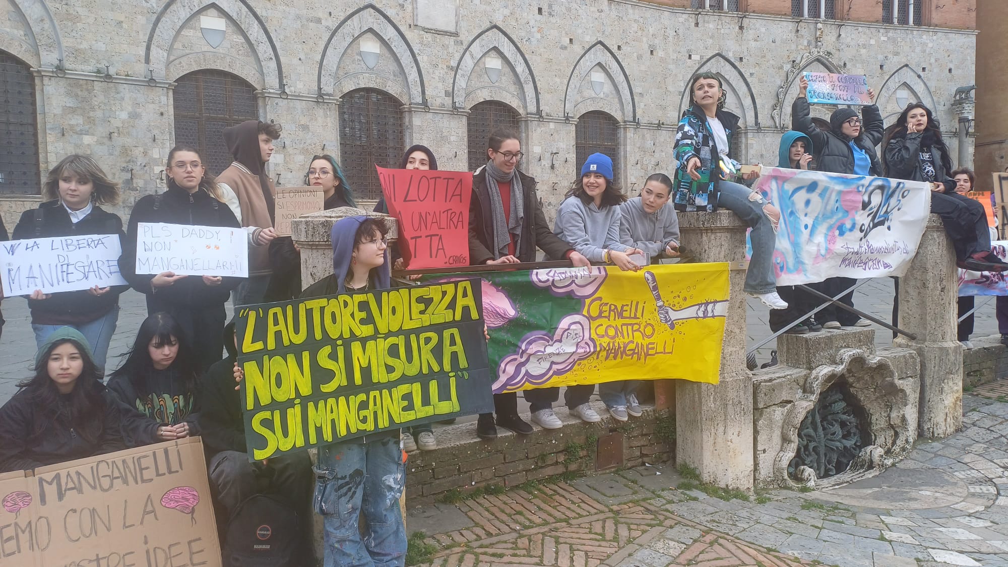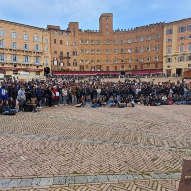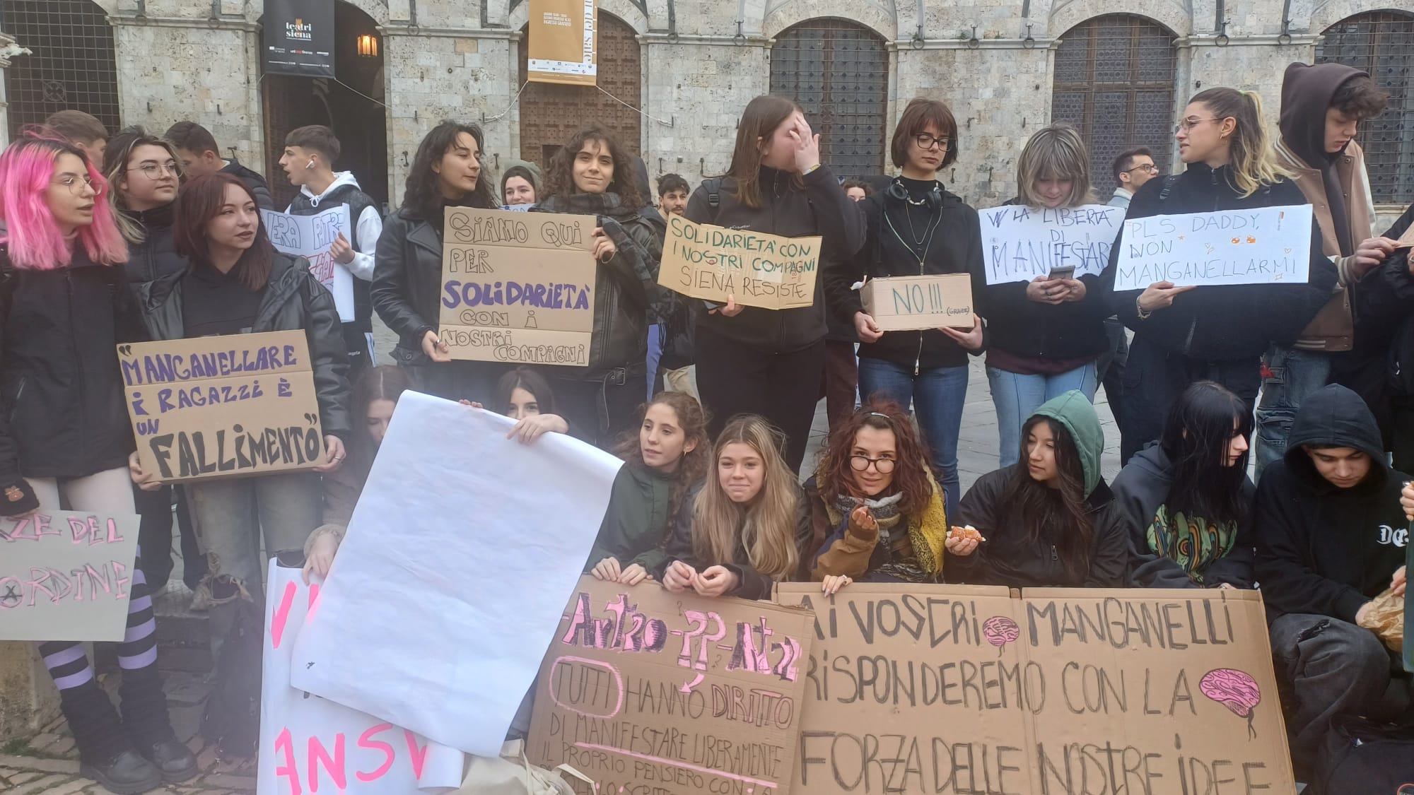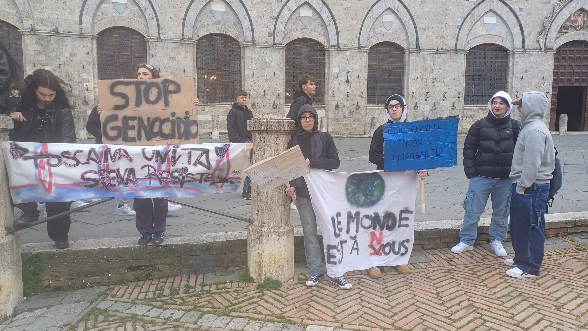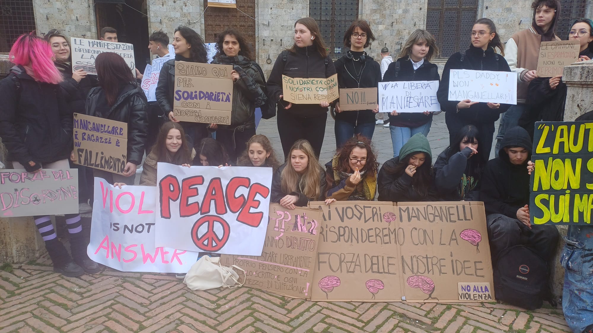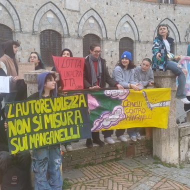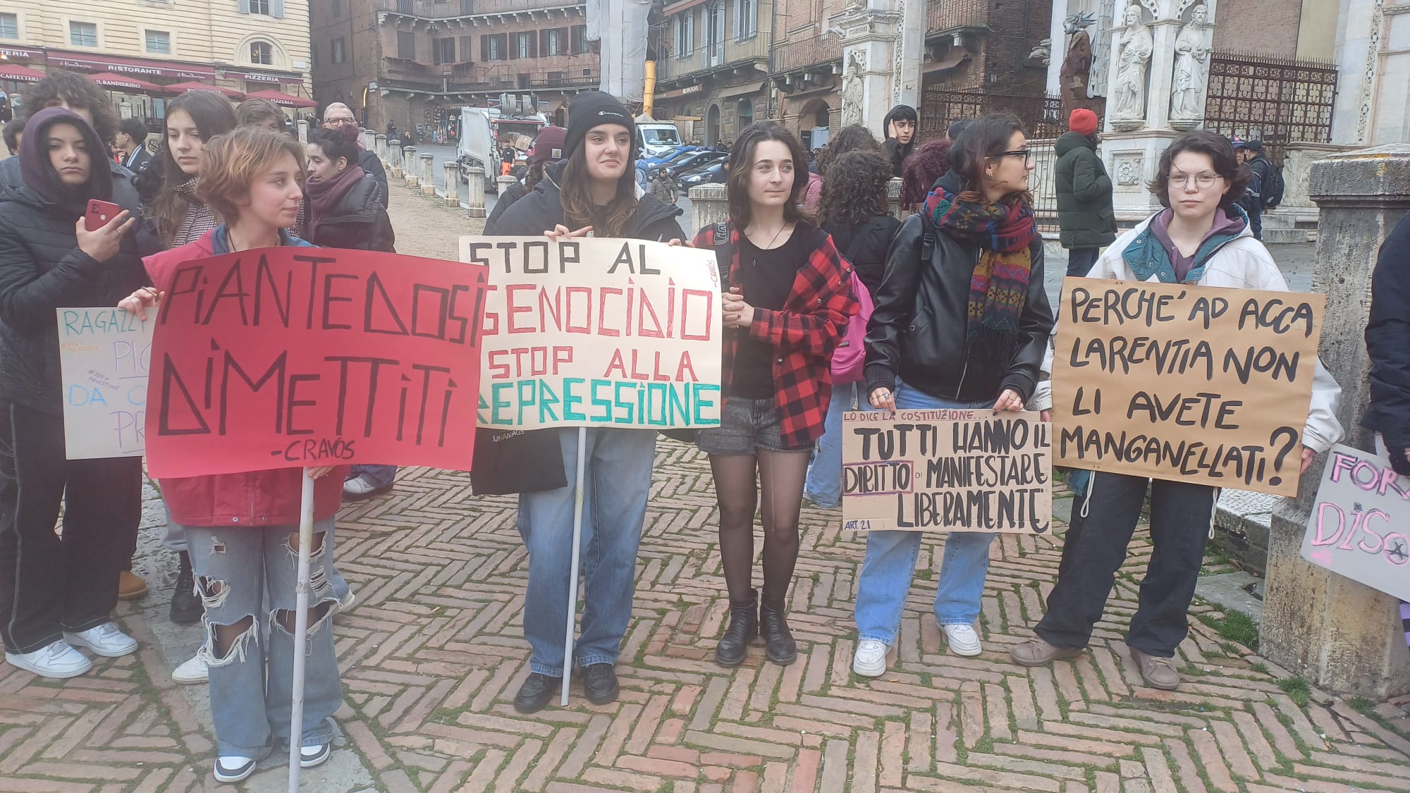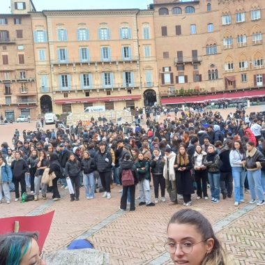 Più di cinquecento studenti sono scesi oggi in Piazza del Campo a Siena per manifestare contro i fatti di Pisa e Firenze e per esprimere solidarietà a quello che sta accadendo nella Striscia di Gaza. “Stop al genocidio” si legge infatti negli striscioni, “più ricciarelli meno manganelli”, poi “Ogni lotta chiama un’altra lotta”, “Contro le vostre manganellate, Piantedosi dimettiti”.