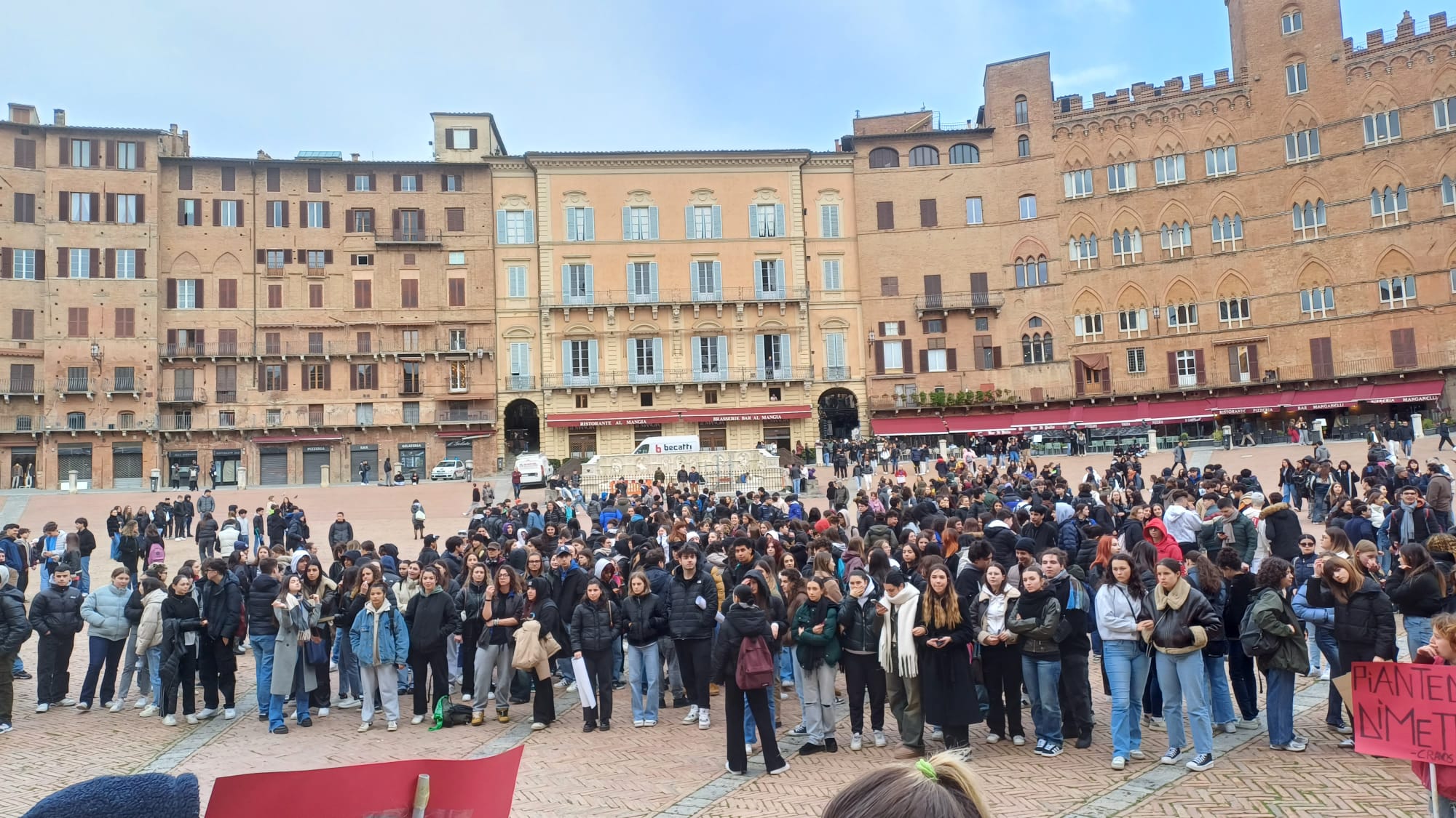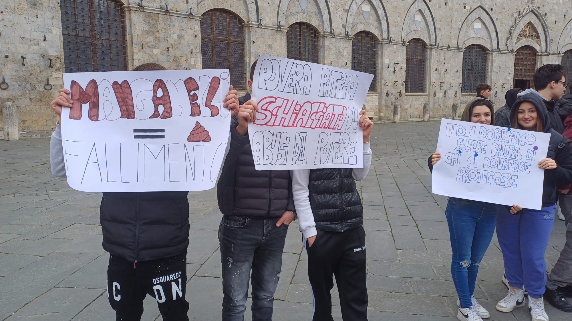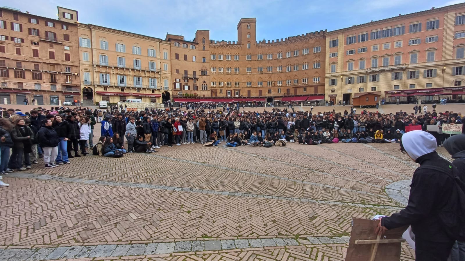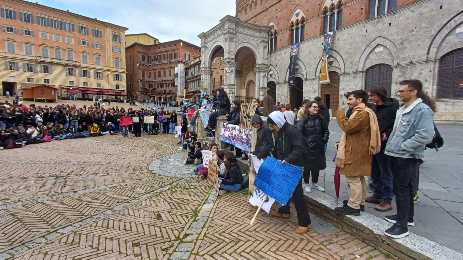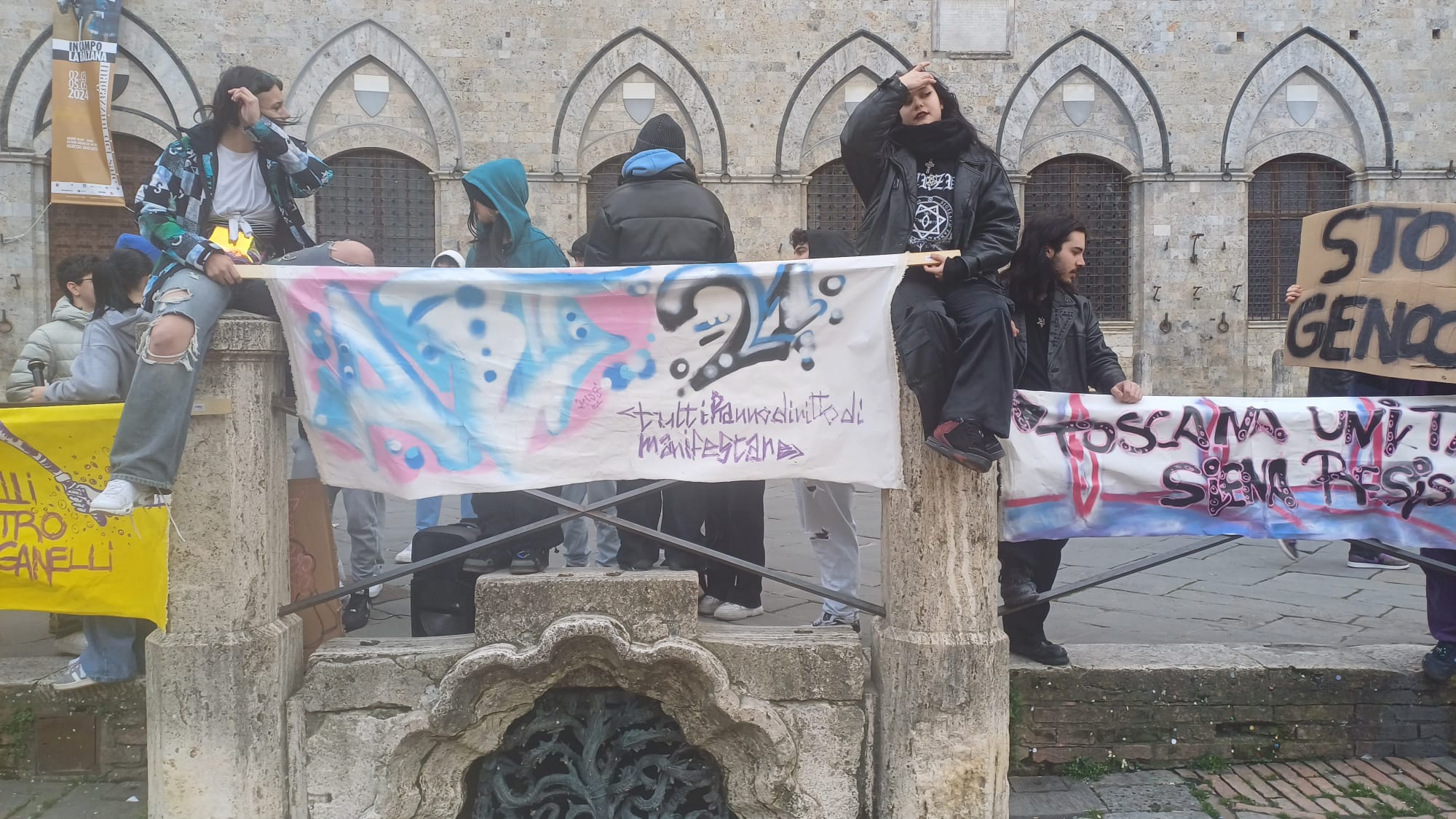 Più di cinquecento studenti sono scesi oggi in Piazza del Campo a Siena per manifestare contro i fatti di Pisa e Firenze e per esprimere solidarietà a quello che sta accadendo nella Striscia di Gaza. “Stop al genocidio” si legge infatti negli striscioni, “più ricciarelli meno manganelli”, poi “Ogni lotta chiama un’altra lotta”, “Contro le vostre manganellate, Piantedosi dimettiti”.