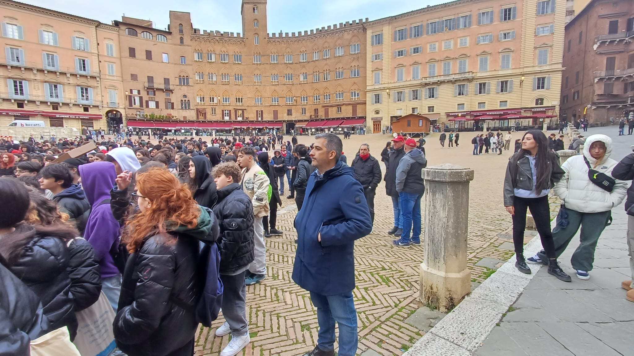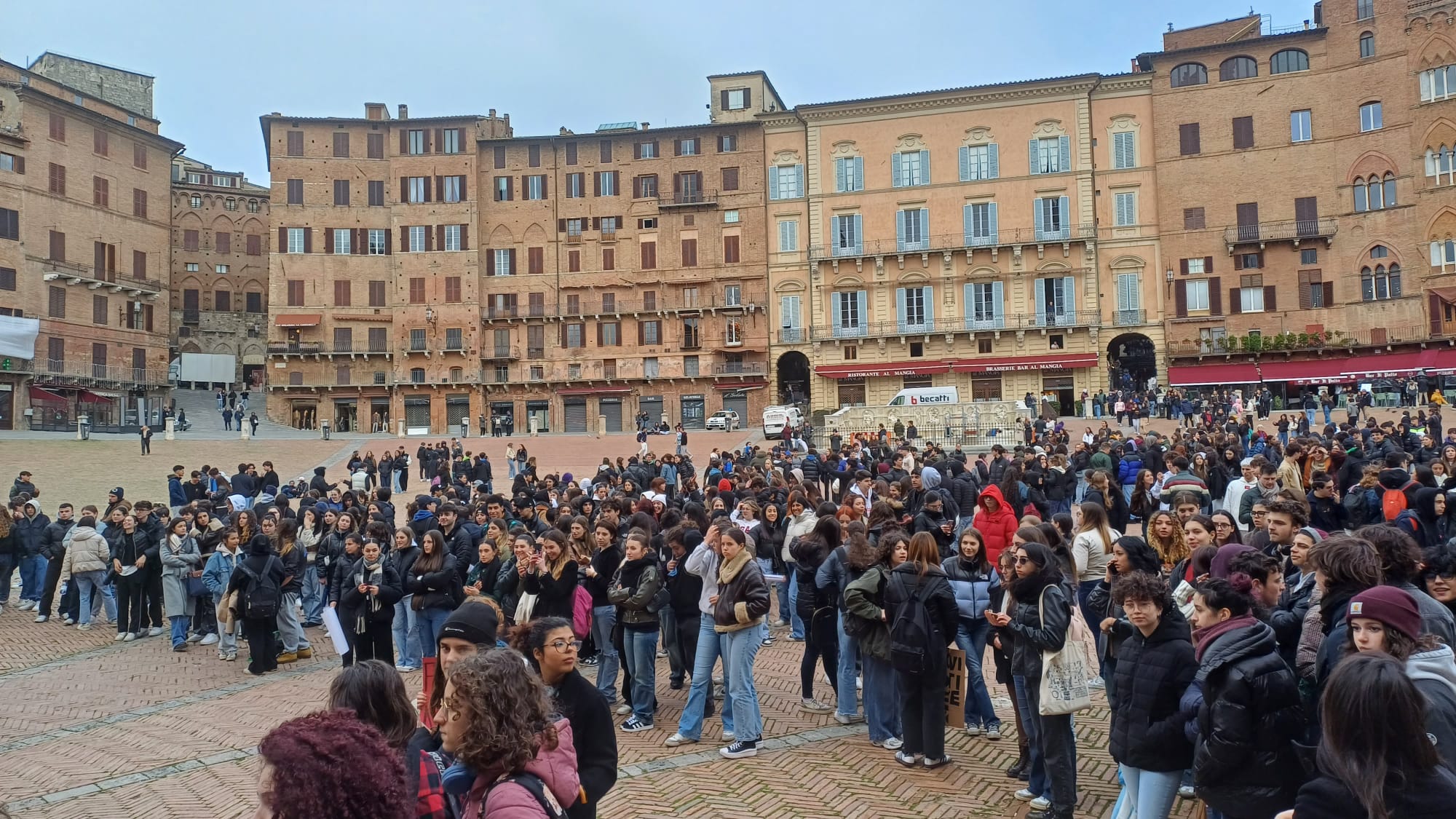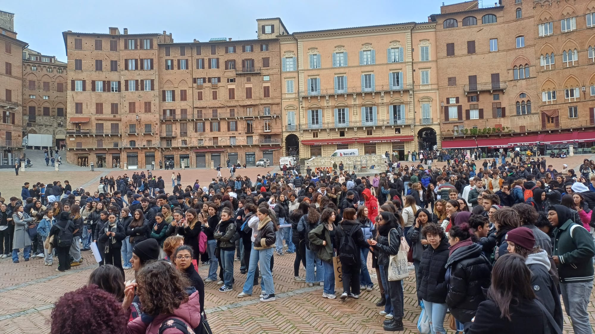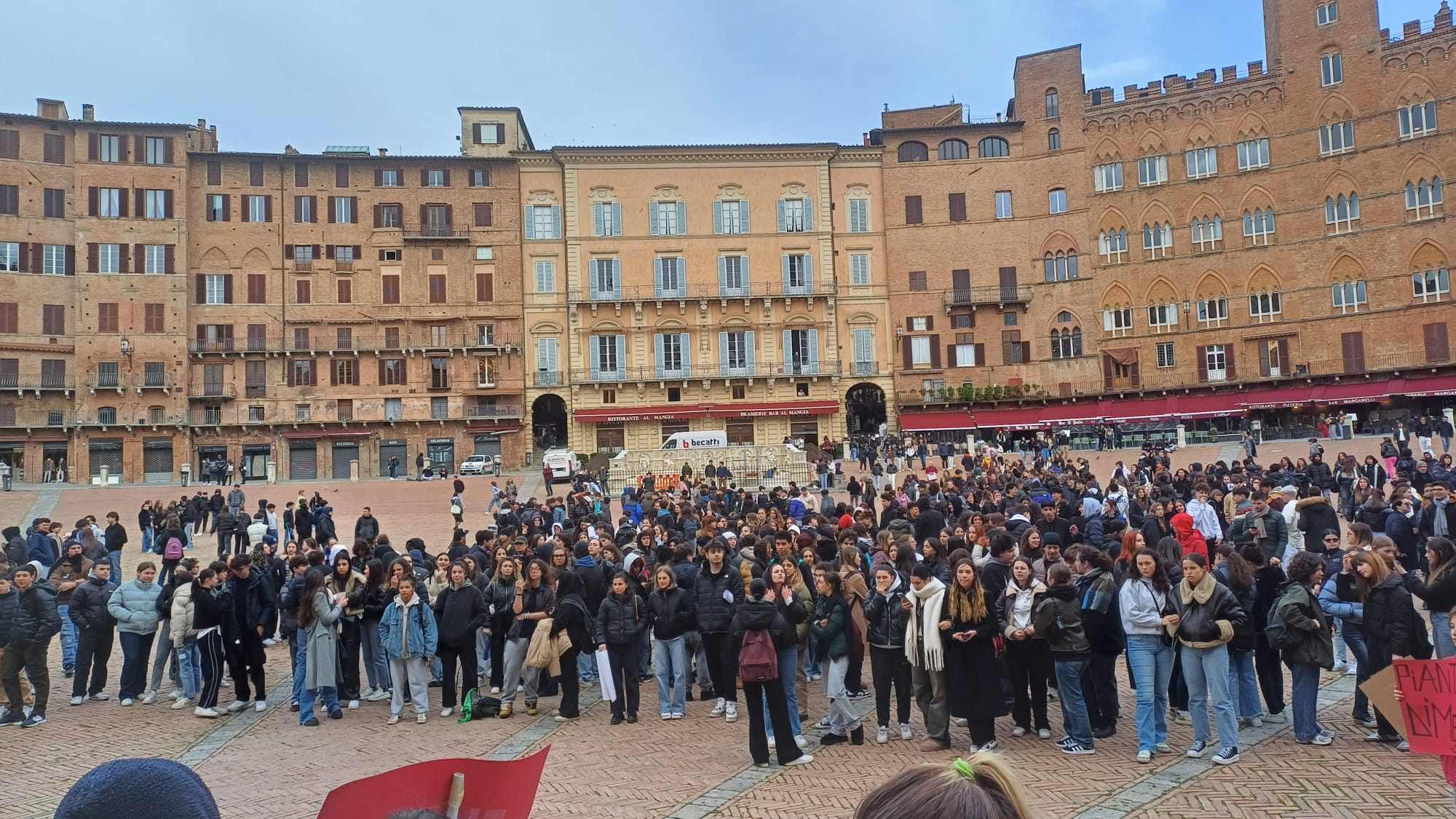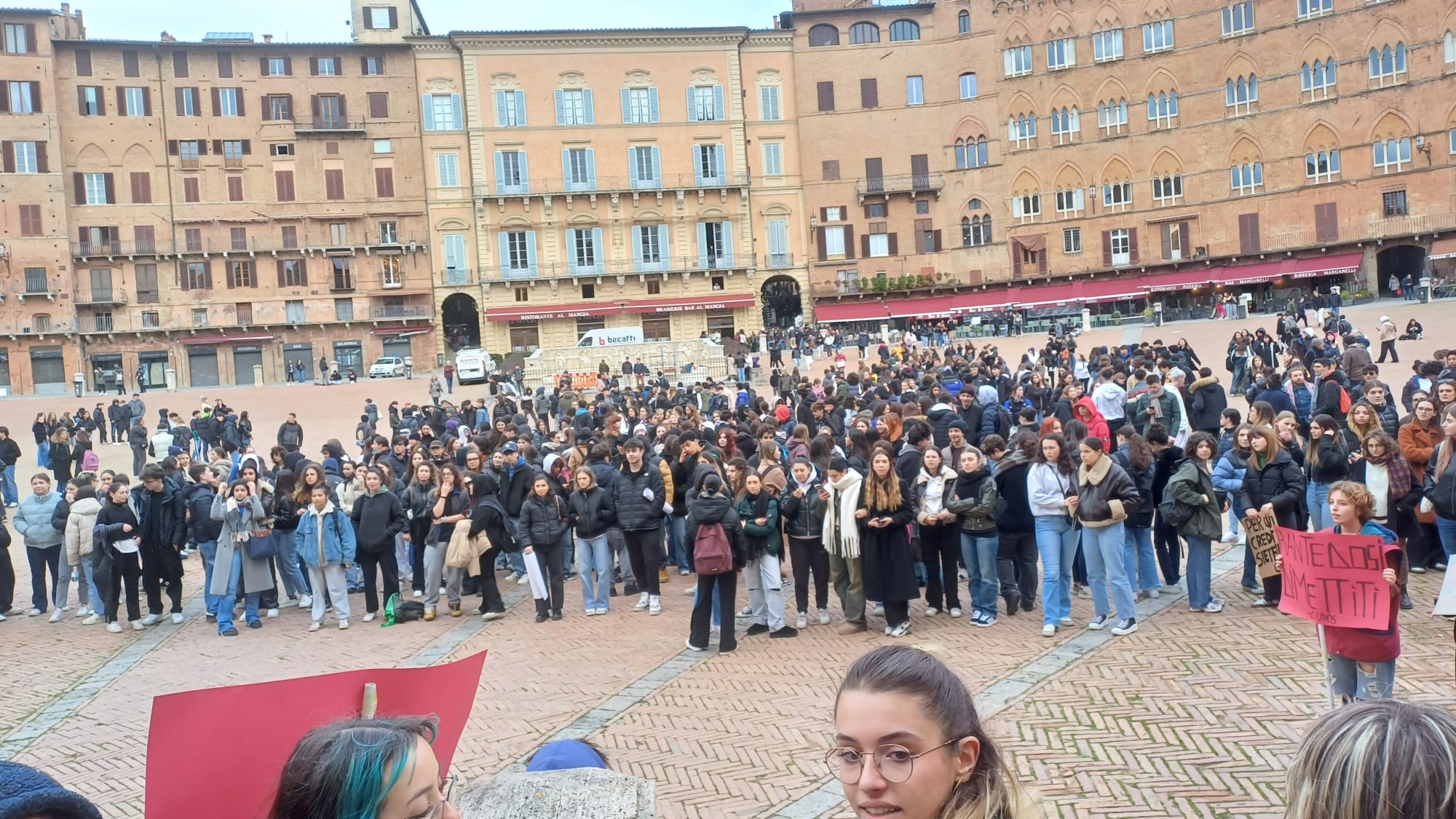 Più di cinquecento studenti sono scesi oggi in Piazza del Campo a Siena per manifestare contro i fatti di Pisa e Firenze e per esprimere solidarietà a quello che sta accadendo nella Striscia di Gaza. “Stop al genocidio” si legge infatti negli striscioni, “più ricciarelli meno manganelli”, poi “Ogni lotta chiama un’altra lotta”, “Contro le vostre manganellate, Piantedosi dimettiti”.