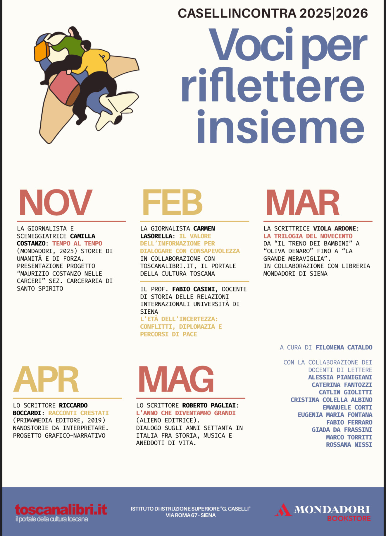 Febbraio porterà al Caselli la giornalista Carmen Lasorella, per un approfondimento sul valore dell’informazione realizzato in collaborazione con Toscanalibri.it, e il professor Fabio Casini dell’Università di Siena con una riflessione su diplomazia, conflitti e percorsi di pace.