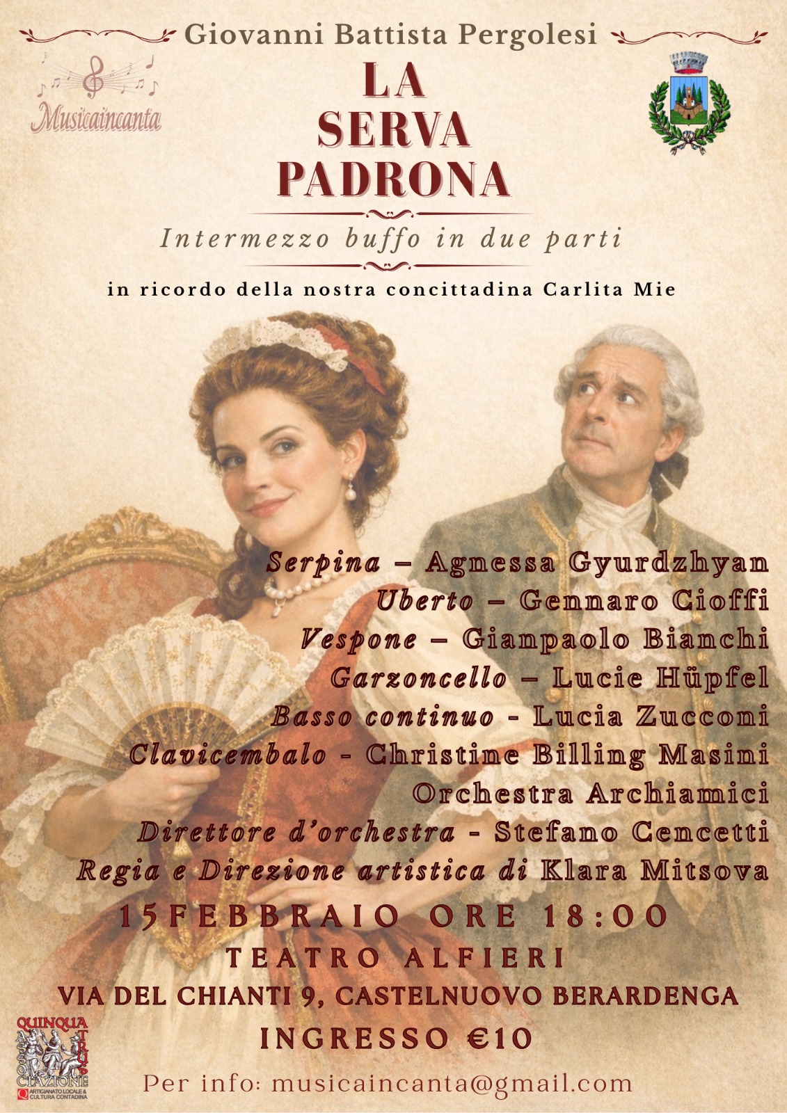 Lo spettacolo, dedicato alla memoria della musicista tedesca Carlita Mie, è realizzato con il patrocinio e il sostegno del Comune di Castelnuovo Berardenga, che rinnova il proprio impegno nella promozione della cultura musicale e delle arti dal vivo. Composta nel 1733, La serva padrona racconta la storia di Serpina, giovane serva astuta e determinata che riesce, con intelligenza e strategia, a ribaltare i ruoli sociali e a sposare il suo padrone Uberto. Accanto ai due protagonisti, il personaggio muto di Vespone contribuisce in modo determinante allo sviluppo dell’azione scenica.