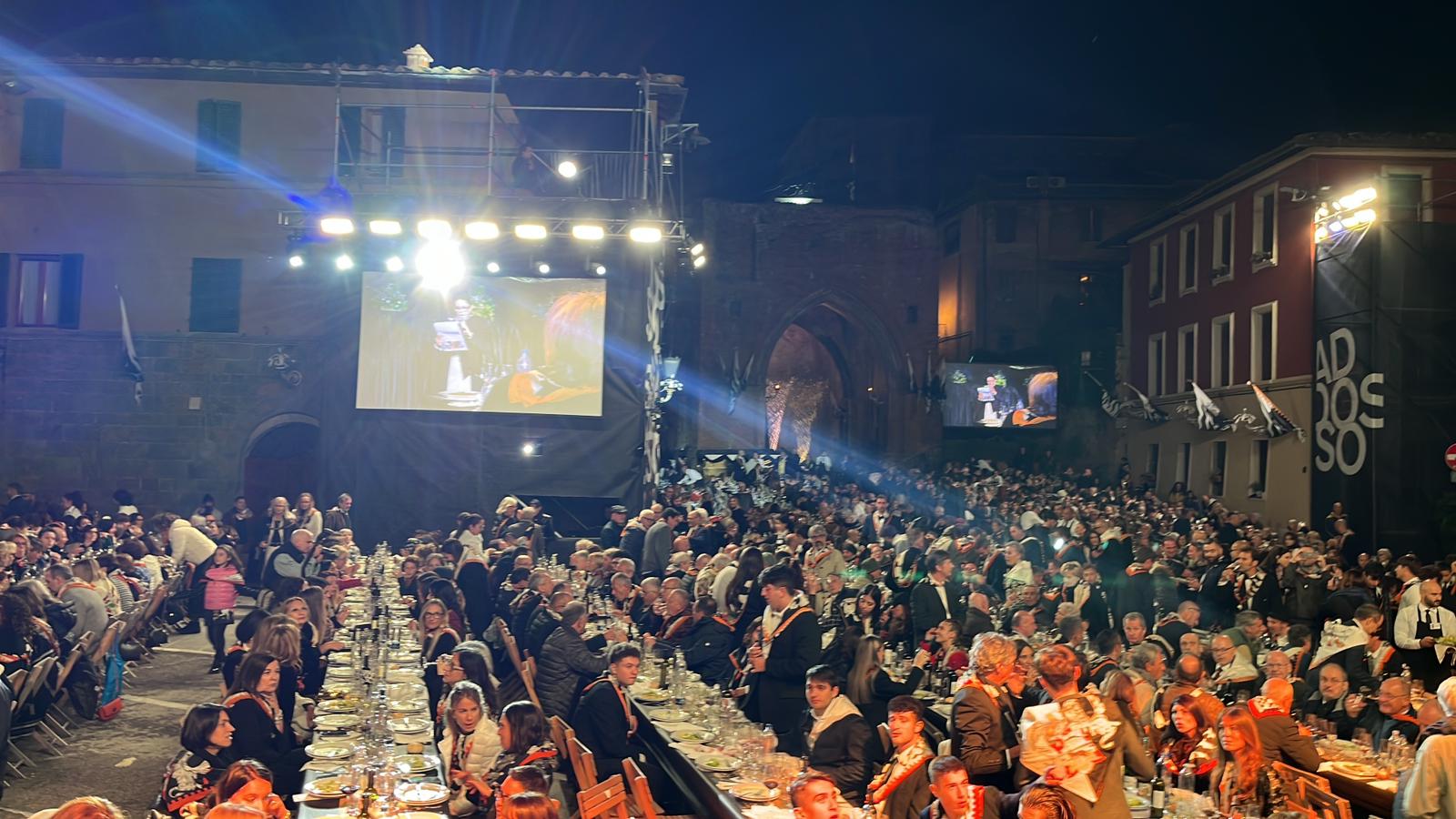 Grande cena della vittoria e festa infinita ieri sera nella Contrada della Lupa. Il popolo di Vallerozzi (erano 1800 i commensali) si è riunito per festeggiare e celebrare il trionfo nella Carriera di agosto, ottenuto con Dino Pes detto Velluto su Benitos. Entusiasmo, orgoglio e soddisfazione, non sono mancate le sorprese e ovviamente è stata rivissuta la magia del trionfo sul tufo. Un allestimento, quello della cena della vittoria, elegantissimo e ricercato, dalle tovaglie delle tavole, passando dai doni della Contrada a ogni partecipante, fino alle etichette delle bottiglie di vino, col filo conduttore dell’oro e del velluto. Mancava solo il grande protagonista Benitos, per una indisposizione.
