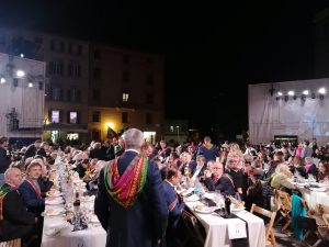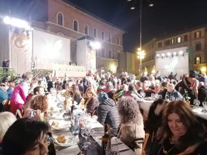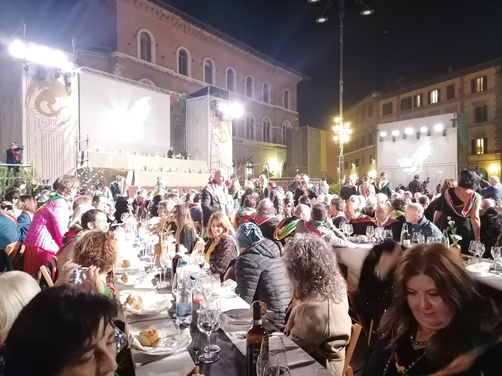 Grande festa e spettacolo questa sera in Piazza Matteotti per la cena della vittoria della contrada del Drago, che celebra il trionfo del 2 luglio con Tittìa su Zio Frac. Ad accompagnare la cena una bella scenografia che ha ricostruito la Piazza del Campo, con al posto del Palazzo Pubblico il tavolo della dirigenza, il cavallo al centro dell’aiuola, mentre il Palio è stato posto sopra una terrazza di fronte al palco della dirigenza, che rappresenterebbe quello del palco dei giudici.
