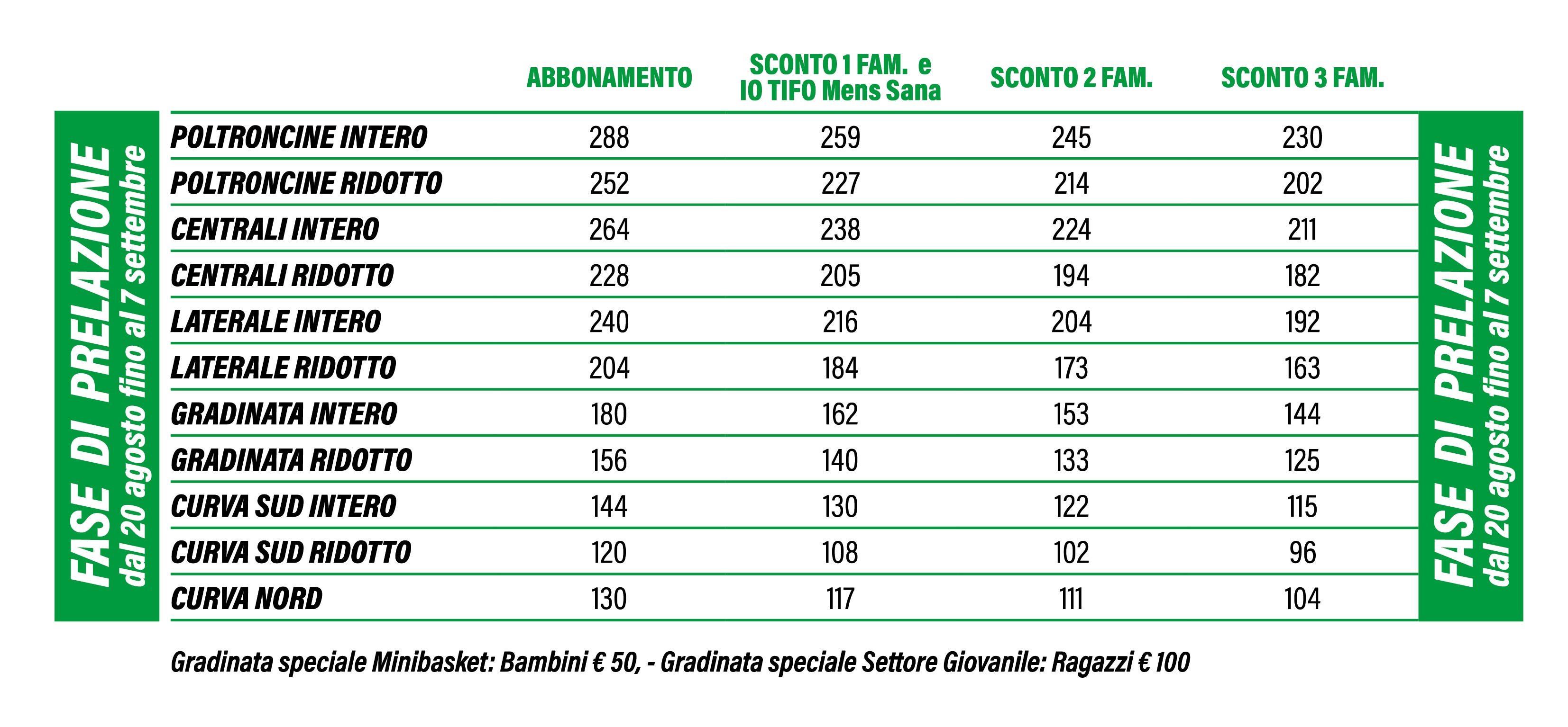Nel successivo periodo, fino al giorno 14 ottobre (escluso), giorno della prima gara interna di campionato con la NPC Rieti, i prezzi dei nuovi abbonamenti per ogni ordine e grado di seduta avranno un ritocco del 3%, ancorato al tasso medio di costo della vita (3,342%).